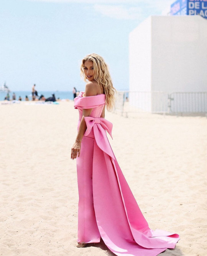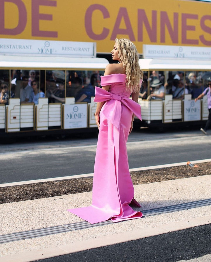Hot Pink Long Mermaid Prom Dress Strapless Off Shoulder Evening Draped with Bow Formal Night Party Gowns Dress