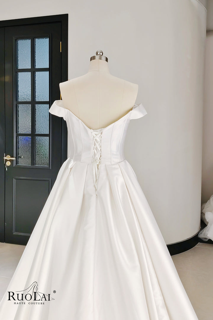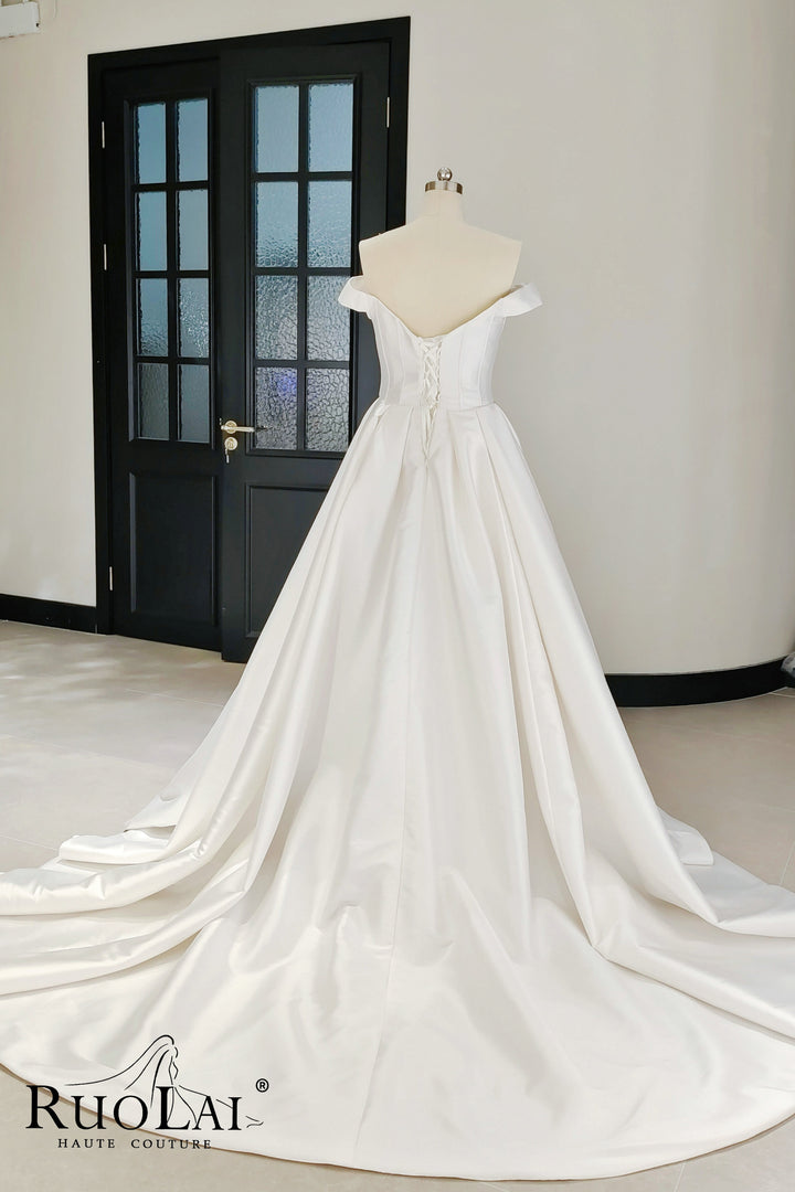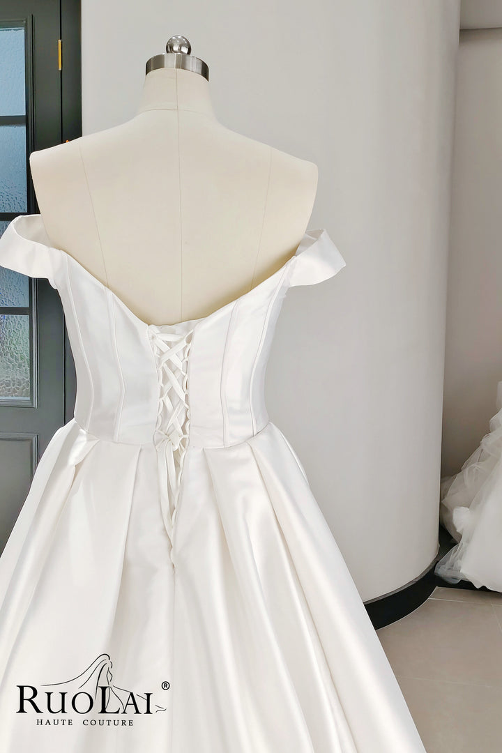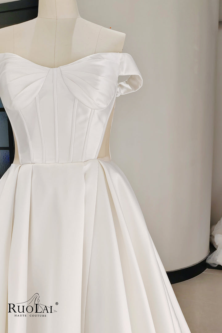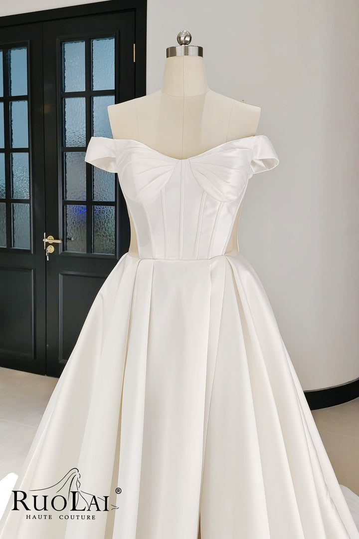 Ivory off-shoulder sweetheart neck soft satin front high hlit wedding dresses pleat design lace up back minimalist style bridal gown.