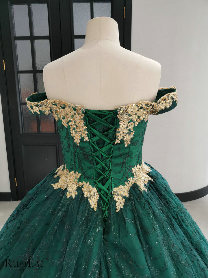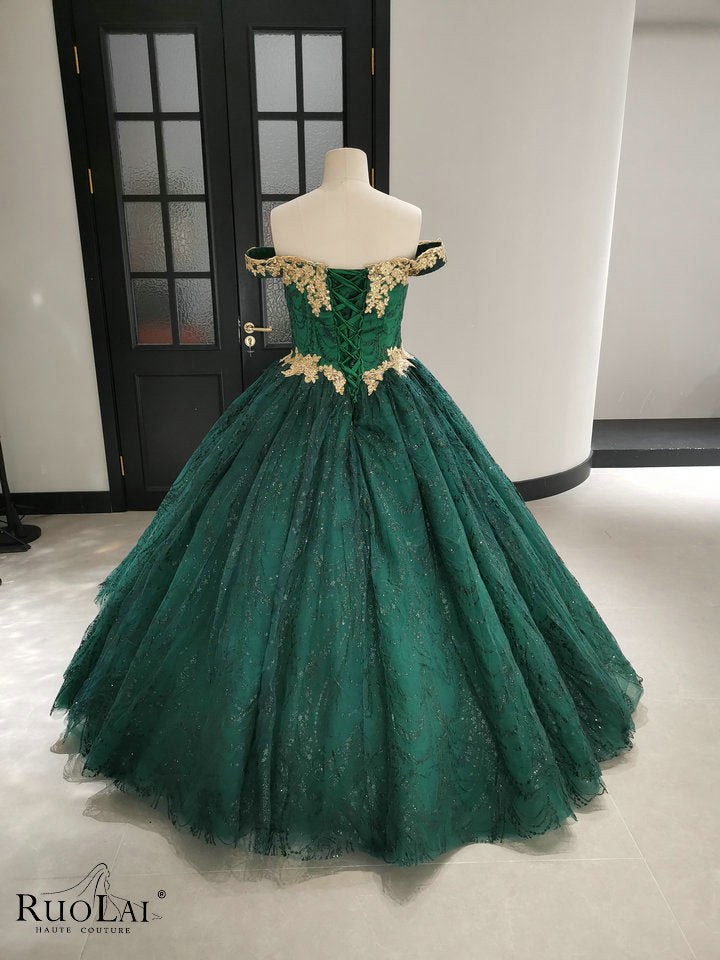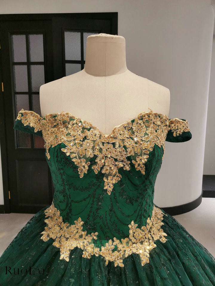 Elevate your party look with this chic gold appliques sequins tulle green quinceanera dress. Adorned with delicate lace appliqués and bling-bling glitter, this elegant gown perfectly blends femininity with modern style. Its exquisite craftsmanship perfectly flatters your figure, offering both comfort and elegance for special occasions. Perfect for formal occasions, it will stand out with its understated charm and refined elegance.