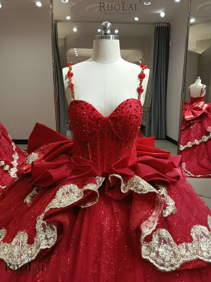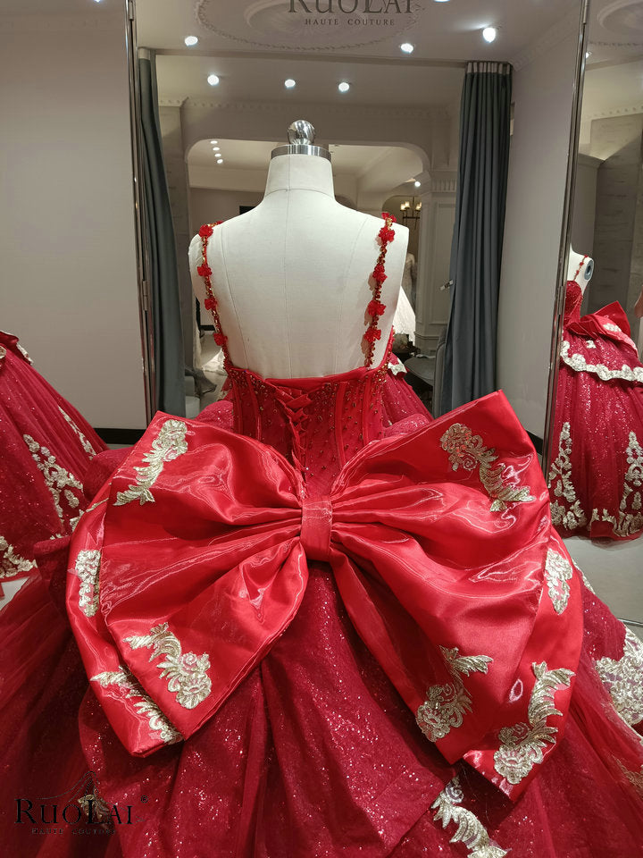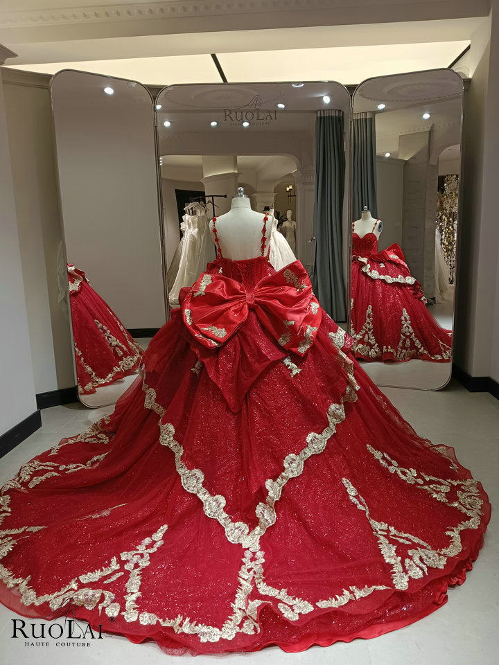 This chic gold lace applique beading tiered with bow red quinceanera dress is the perfect finishing touch to your quinceanera look. Adorned with delicate lace appliqués and glitter, and featuring a delicate sweetheart neckline and spaghetti straps that accentuate your delicate collarbone and décolletage, this quinceanera dress perfectly blends elegance with modern style. Its exquisite craftsmanship flatters your figure, while its understated charm and refined elegance are sure to make you stand out.