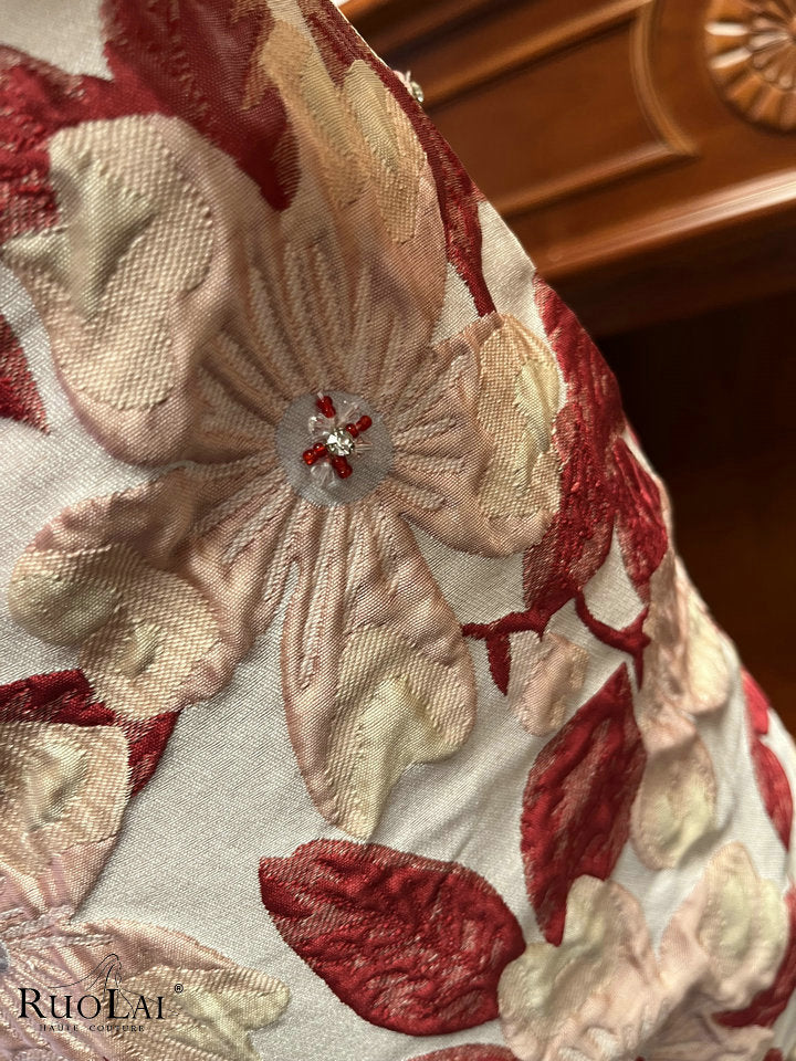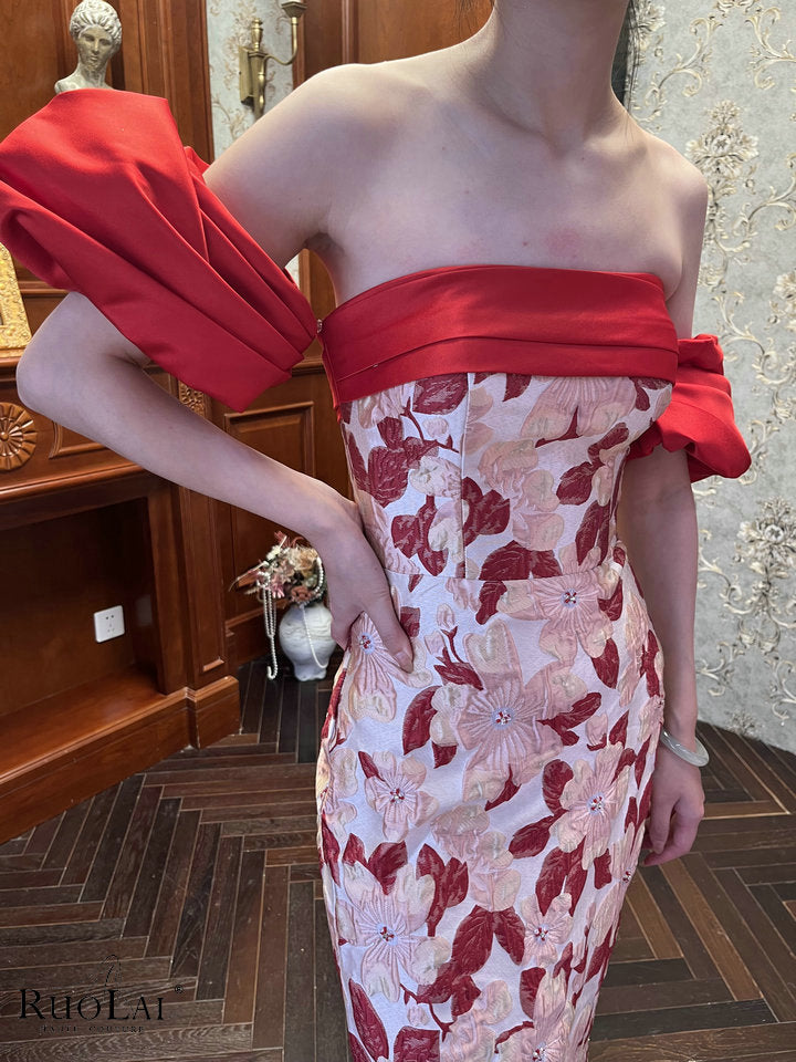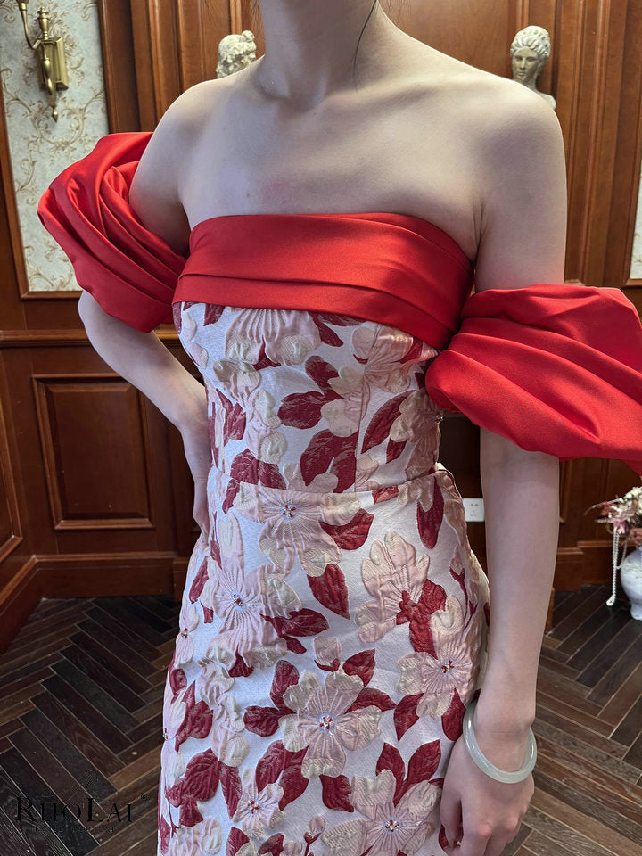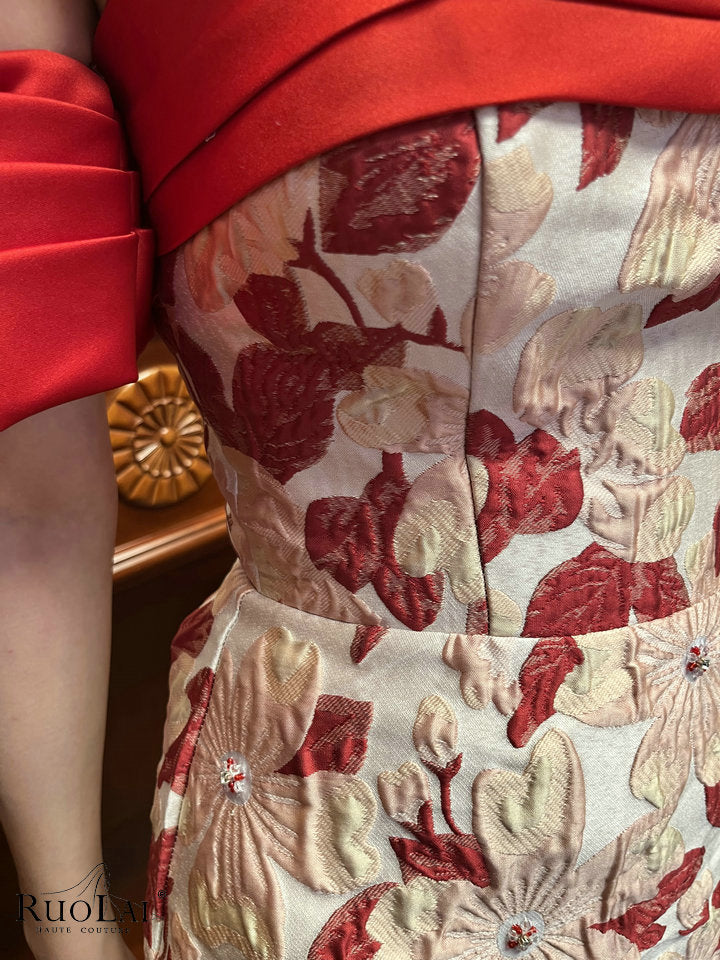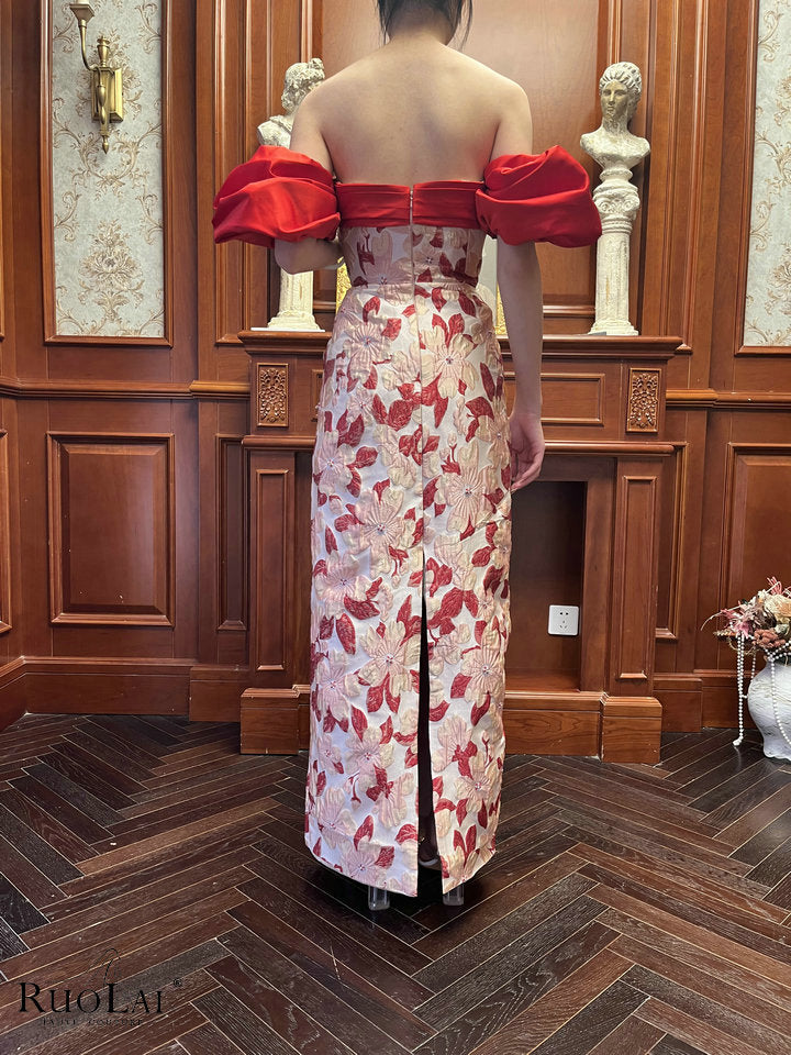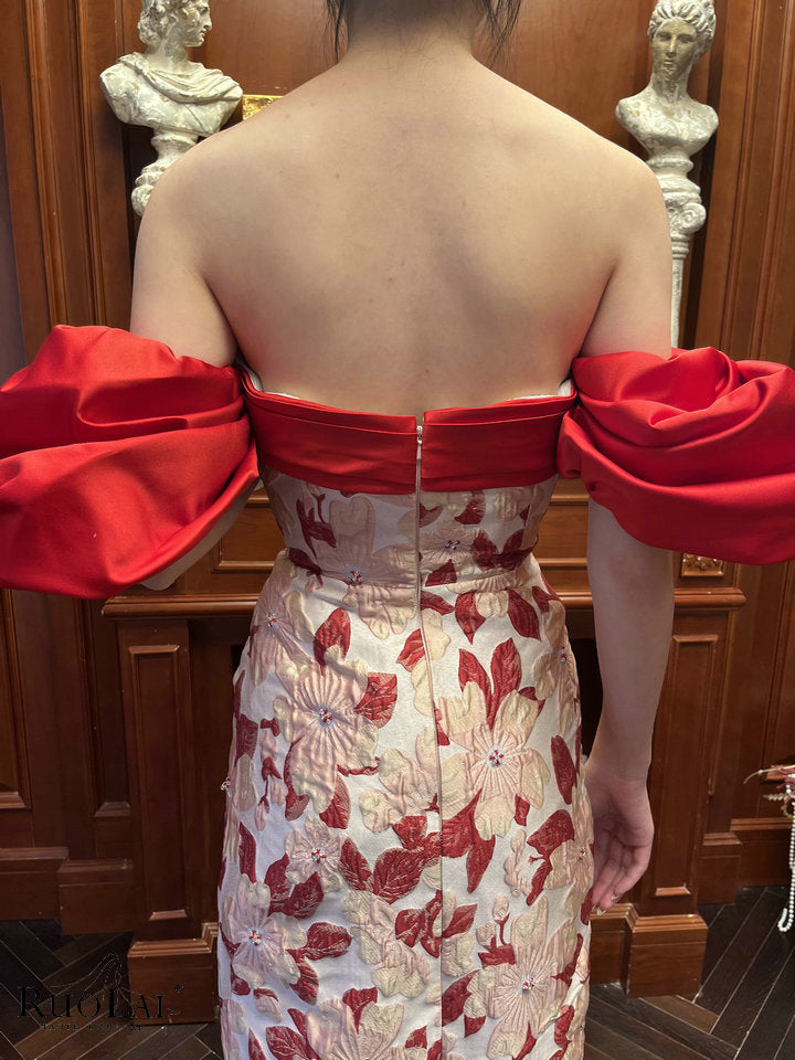 This elegant red embroidered floral bridal wedding party dress is a graceful straight gown for women. Delicate, detachable puff sleeves add a touch of sophistication, creating a graceful movement and sophisticated silhouette. Perfect for formal occasions, this gown blends classic style with modern elegance, ensuring you stand out with confidence.