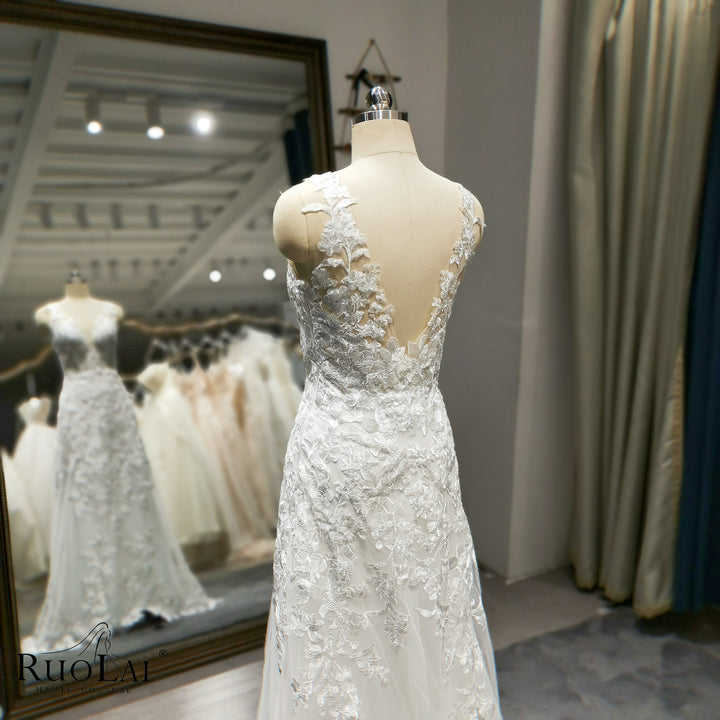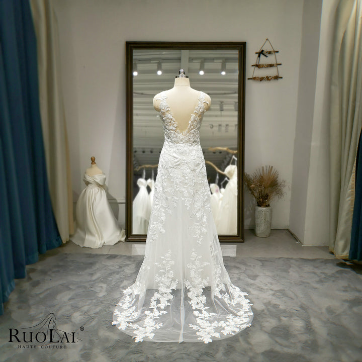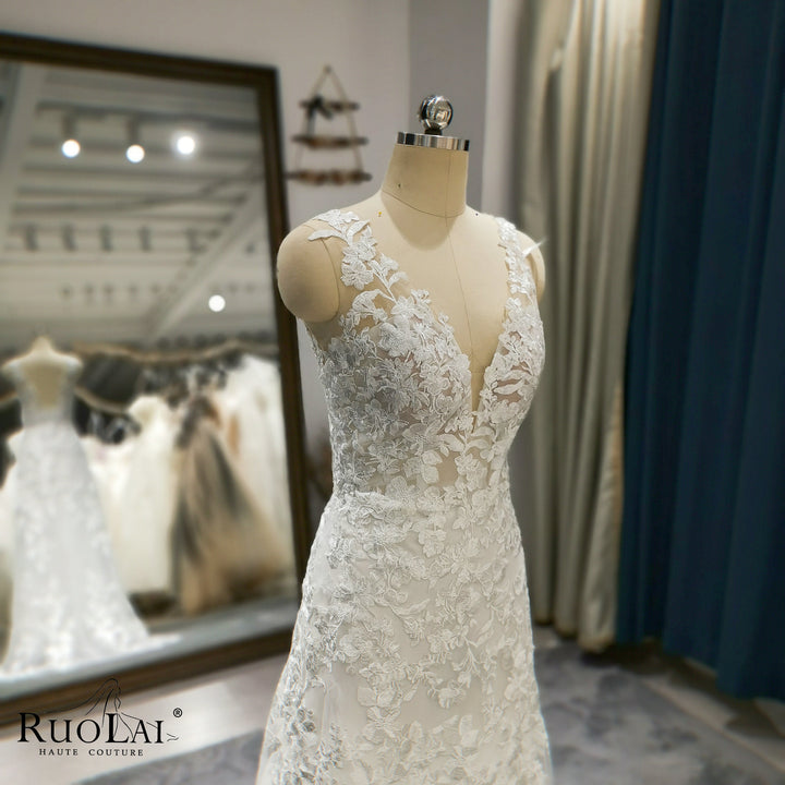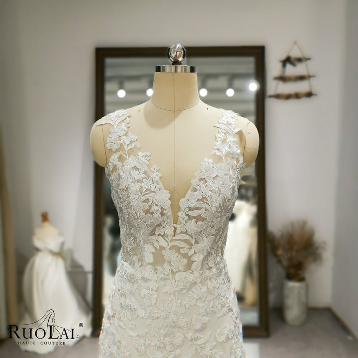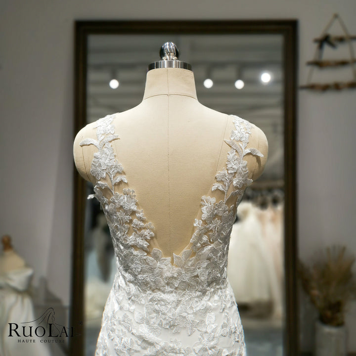 QW01065 Luxury Appliques Deep V-Neck Lace Spaghetti Strap Wedding Dress