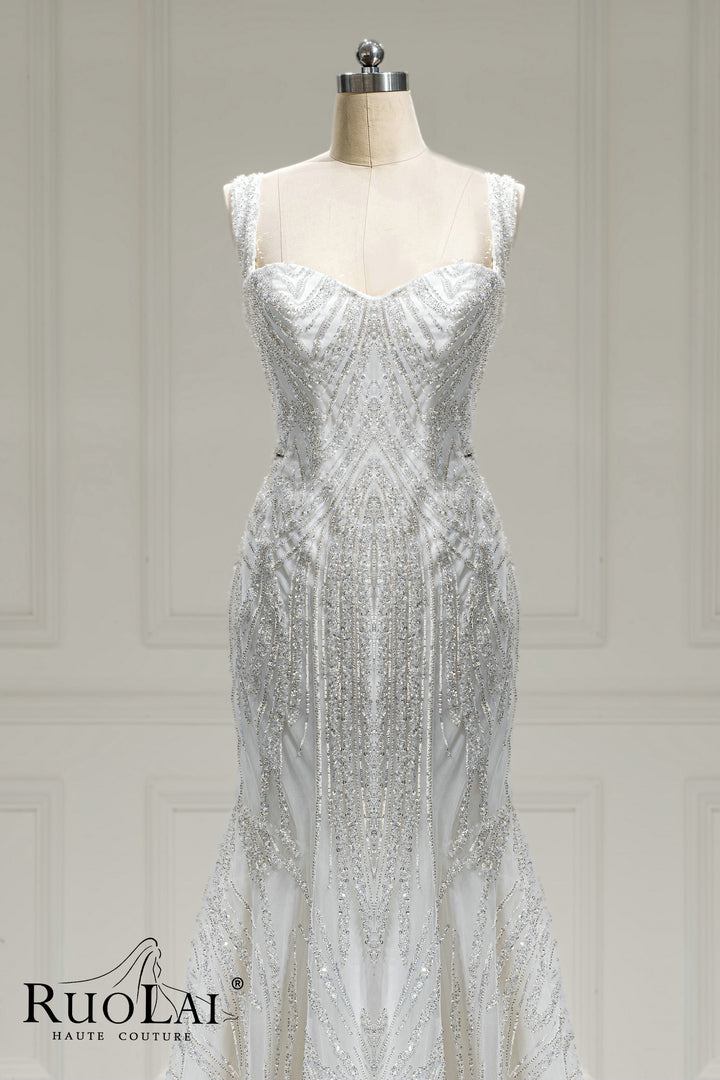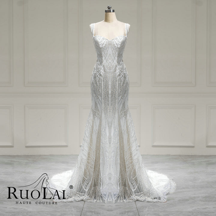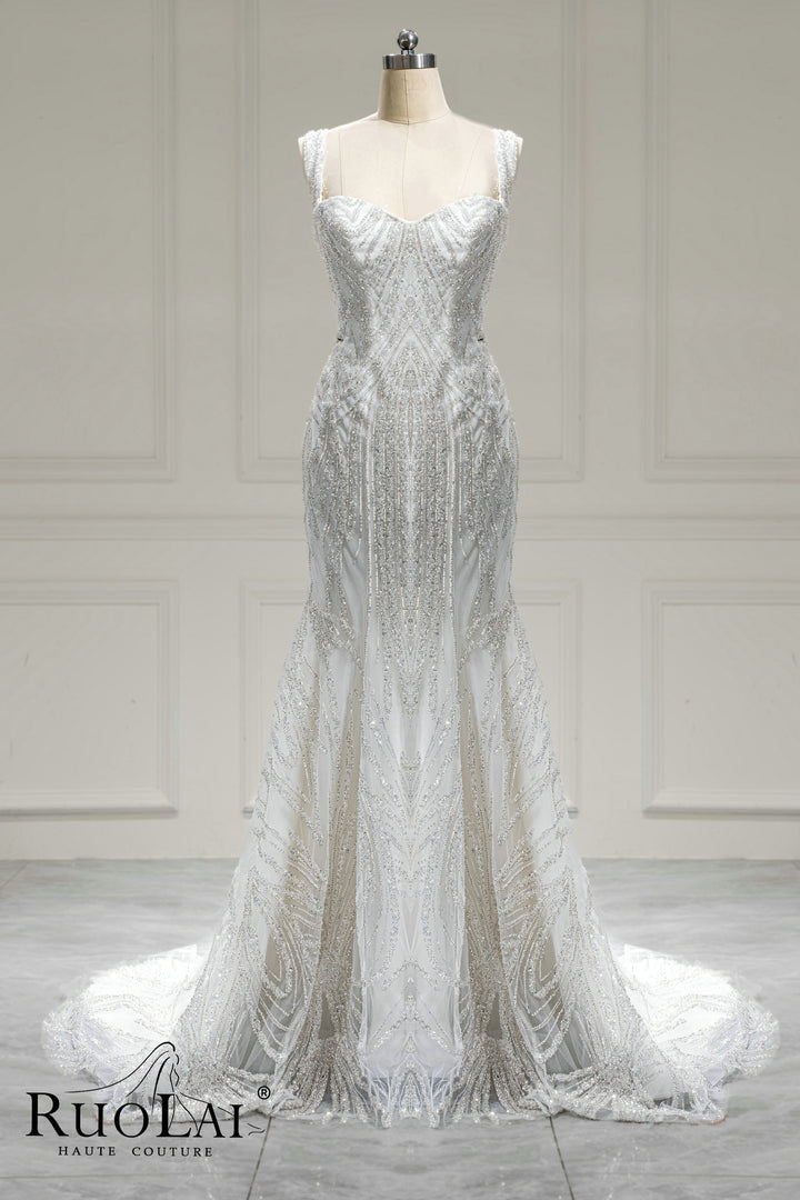 Luxury Beaded Sweetheart Neckine Sequins with Detachable Train Mermaid Wedding Dress Lace-Up Back Bridal Gown.