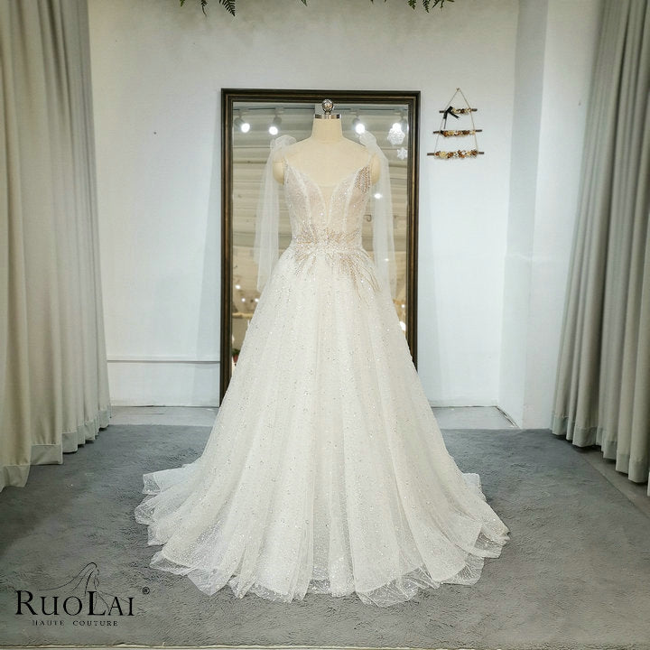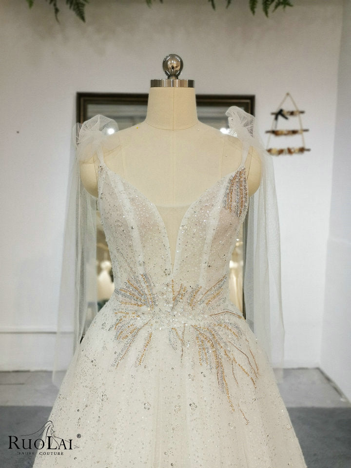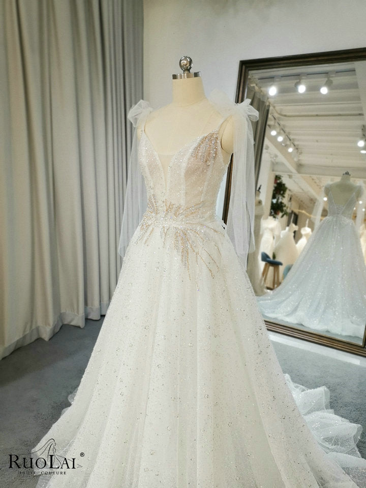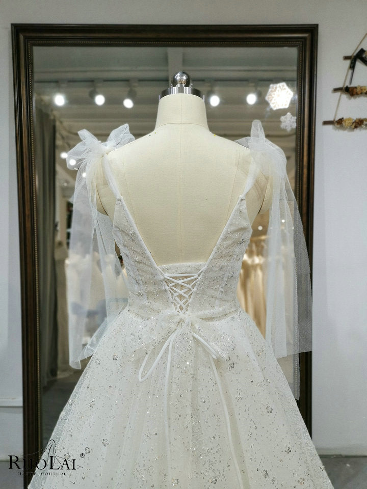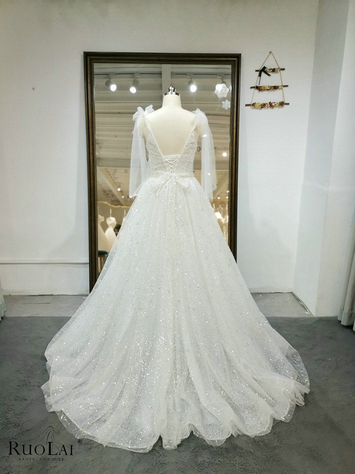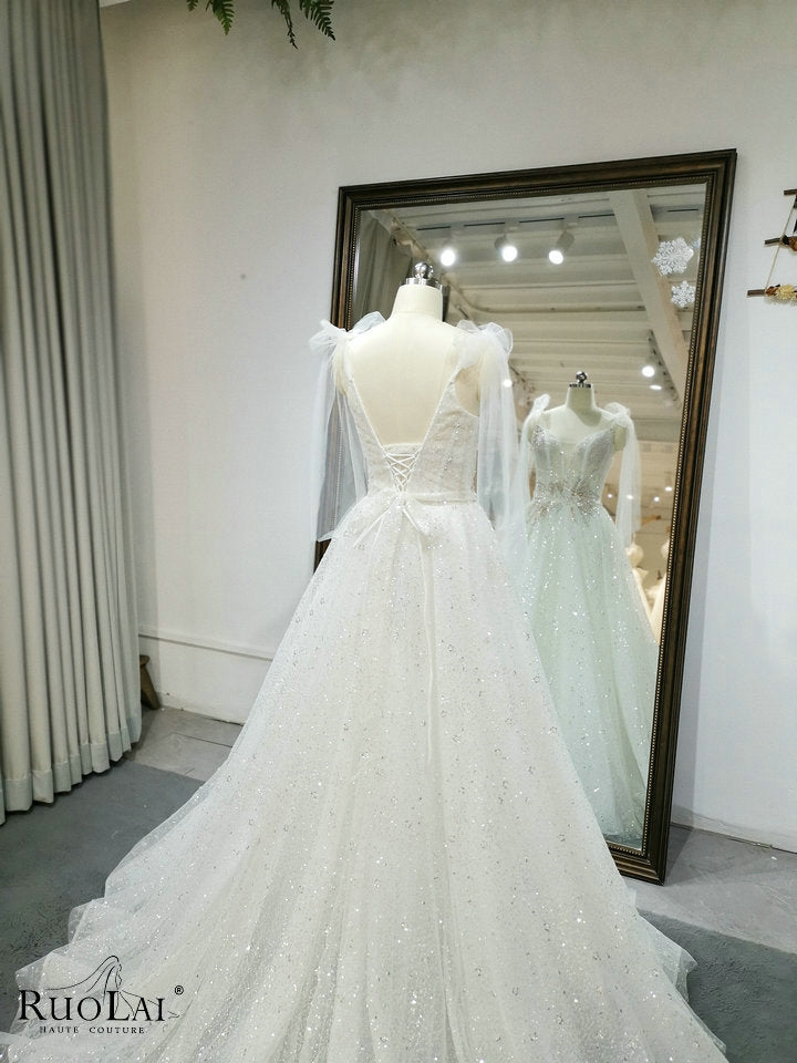 QW01328 Luxury Bright Women Spaghetti Strap with Bow Wedding Dresses