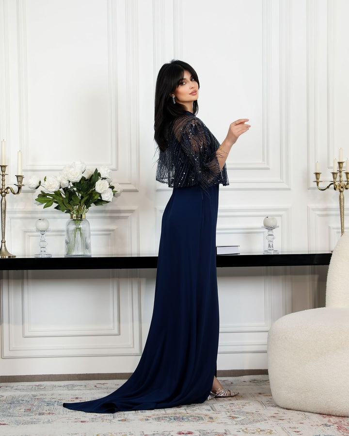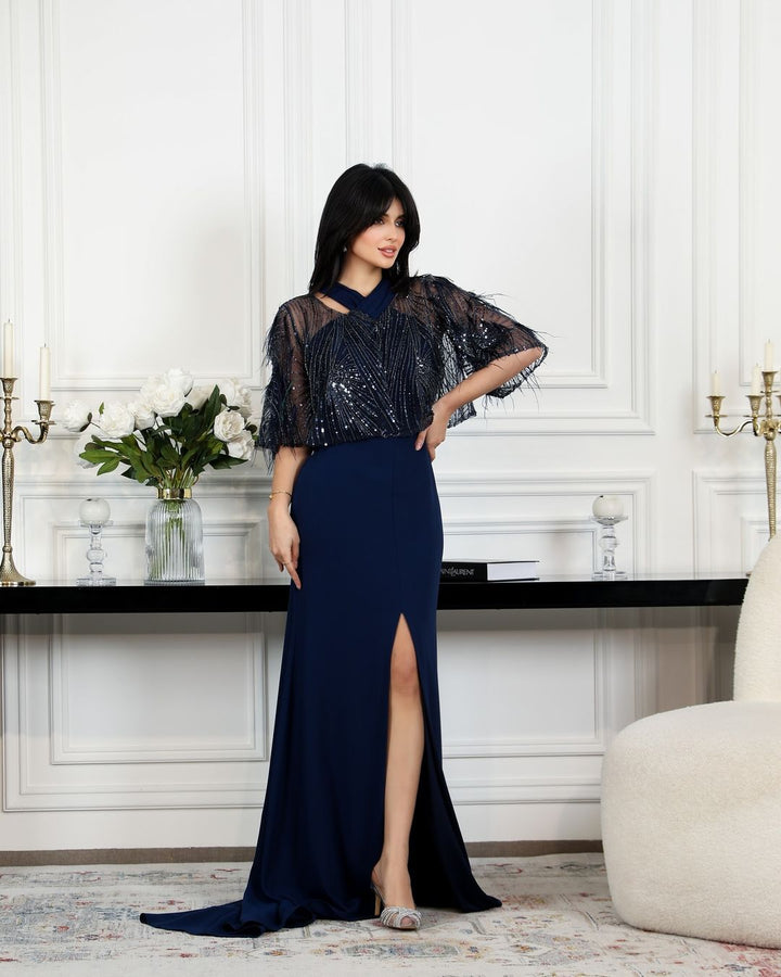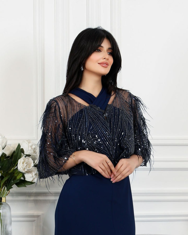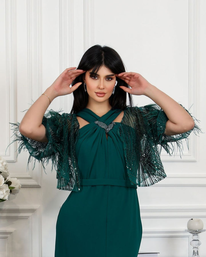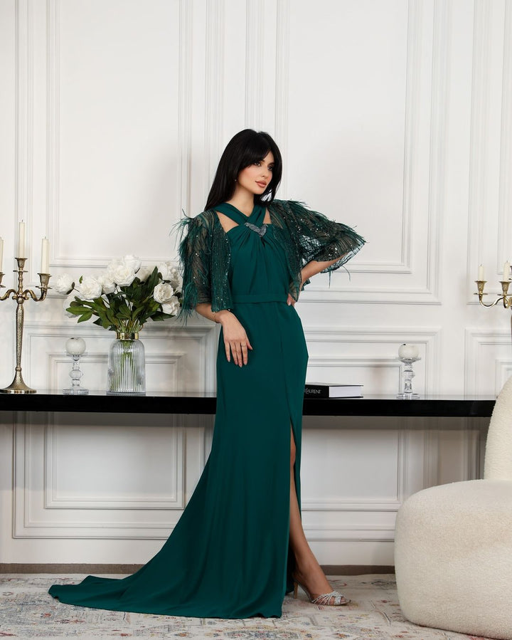 Luxury Criss-Cross Neck Satin Mermaid Evening Dress for Party Front High Slit with Feather Jacket Party Gowns