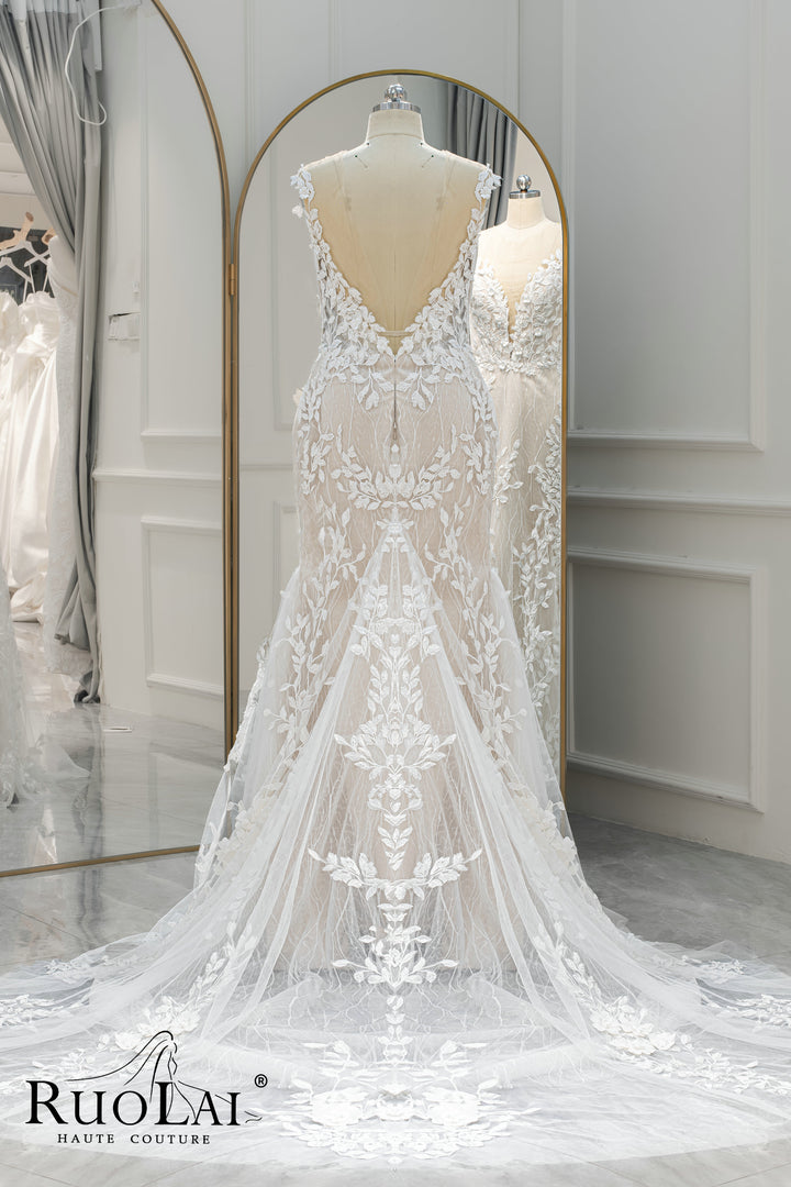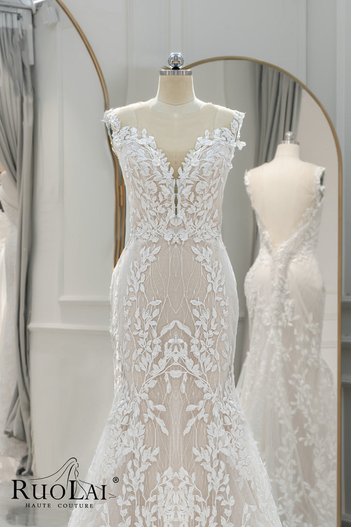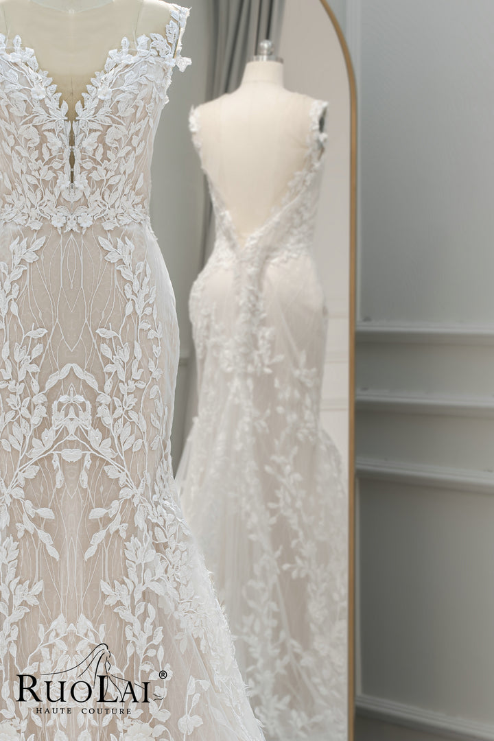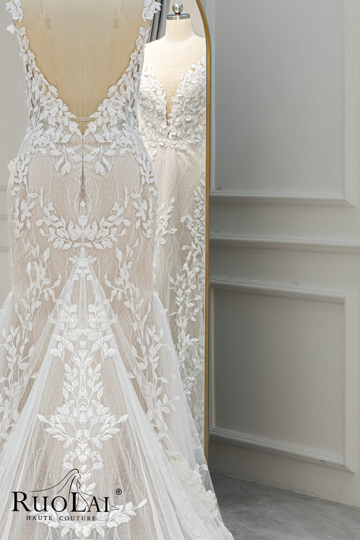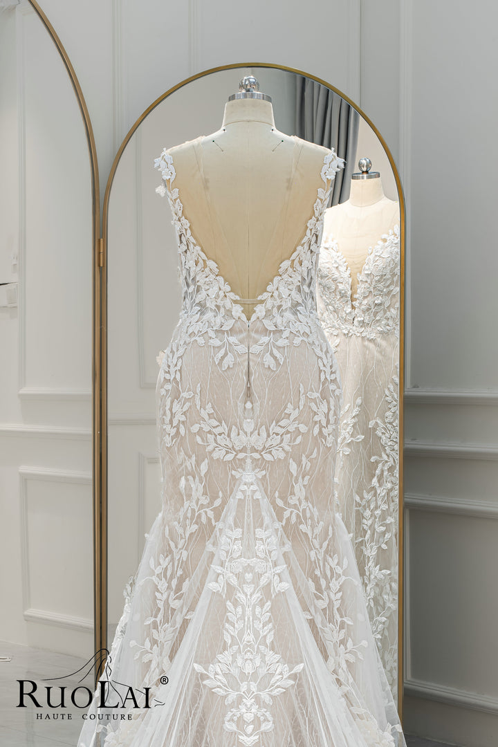 Luxury Full Lace V-neckline Backless Nude lIned Mermaid Wedding Dres