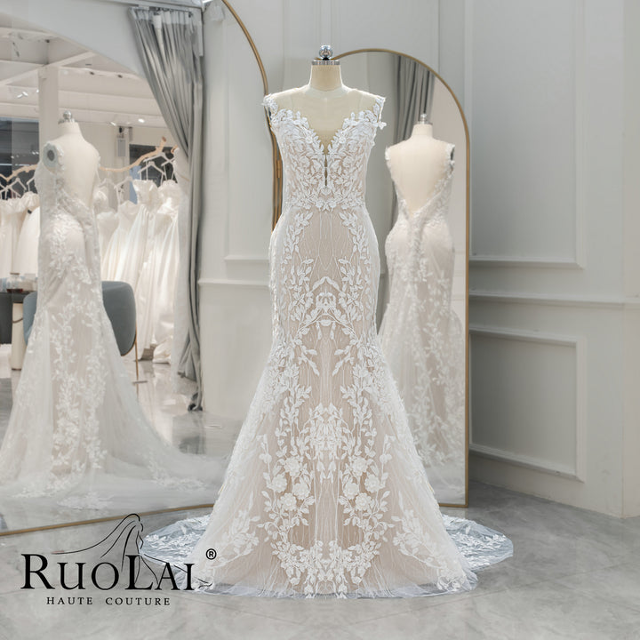 Luxury Full Lace Backless Mermaid Wedding Dress Elegant Dress Bride V-neckline Sleeveless Nude lIned Bridal Gown Floor Length
