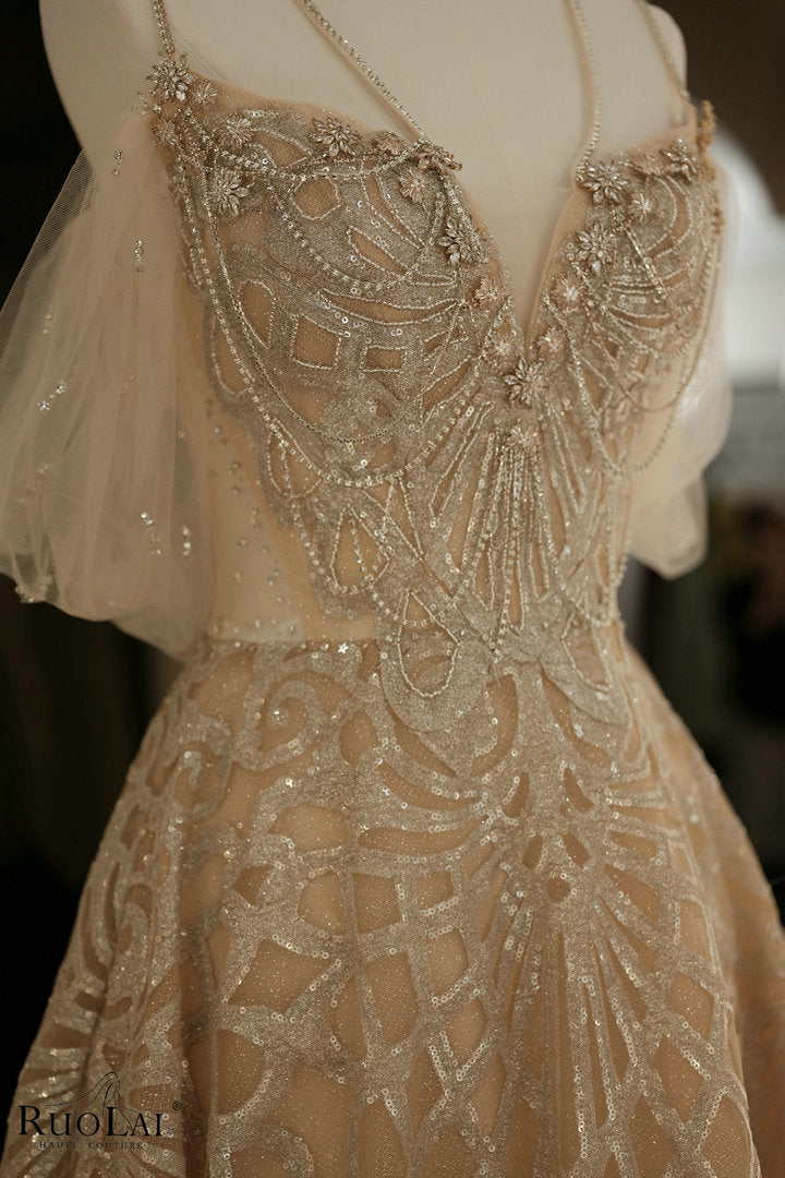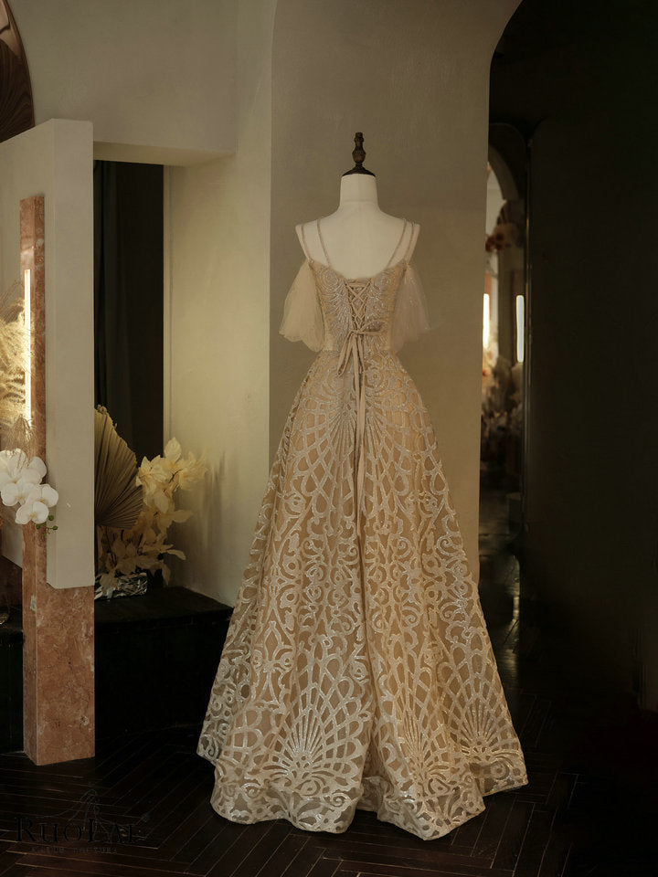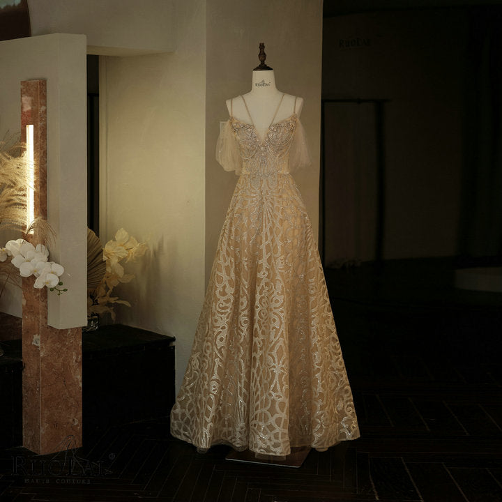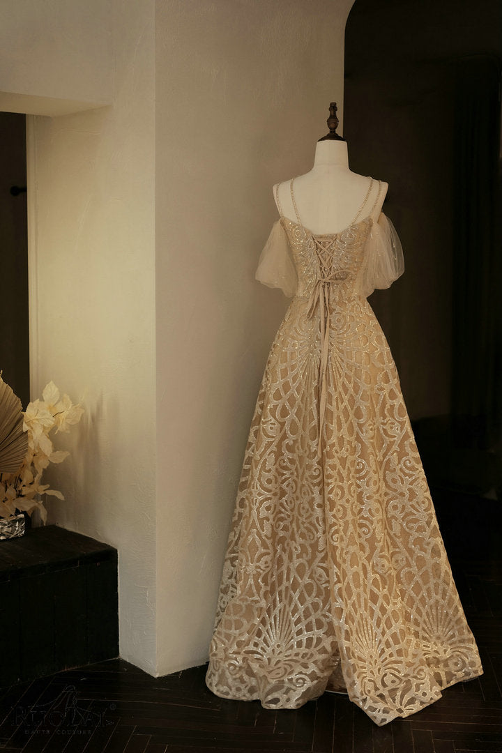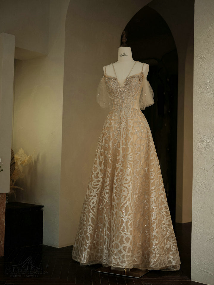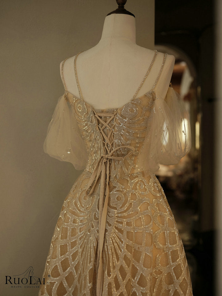 Luxury Golden Spaghetti Strap Sequins Evening Dress
