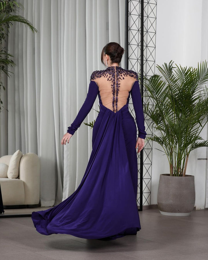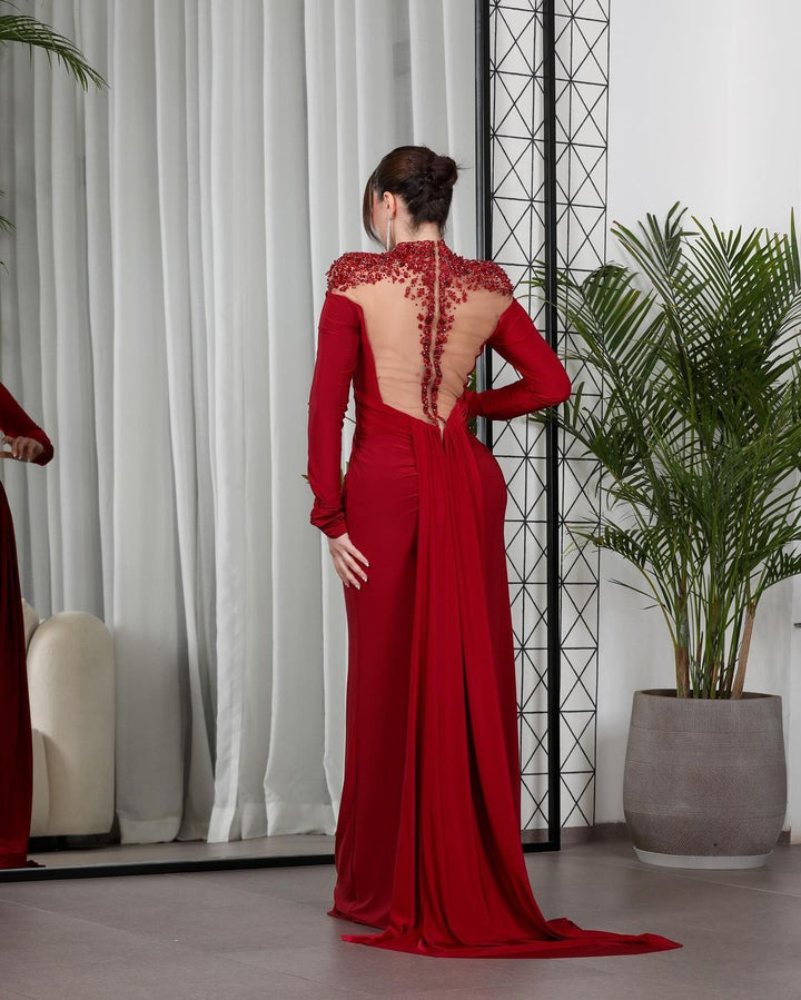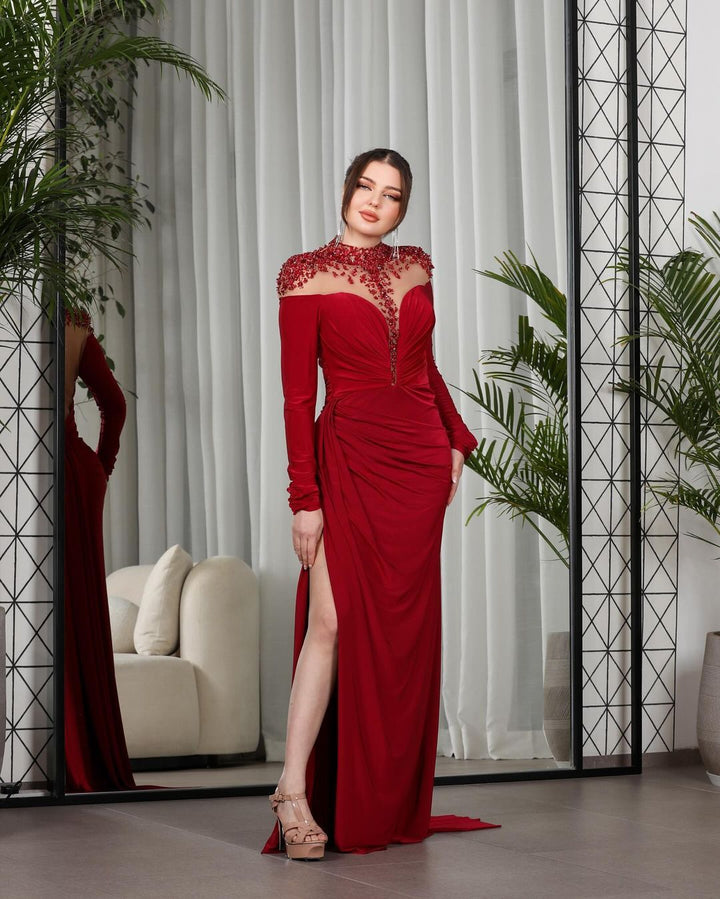 Luxury High Satin Mermaid Ball Gown Evening Dress Long Sleeve Beading Front Side Slit Formal Party Dress