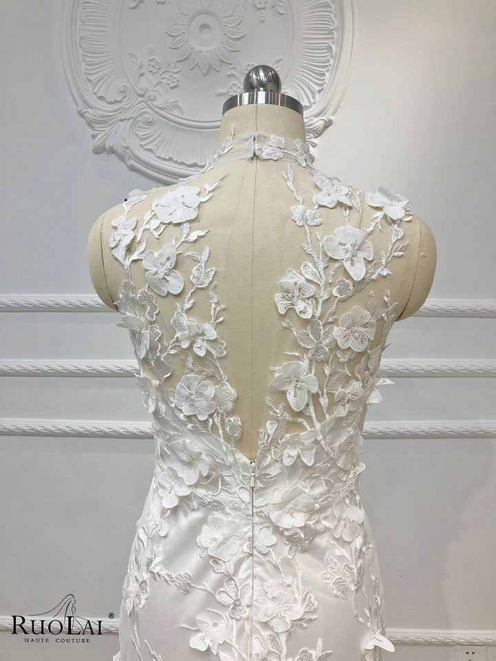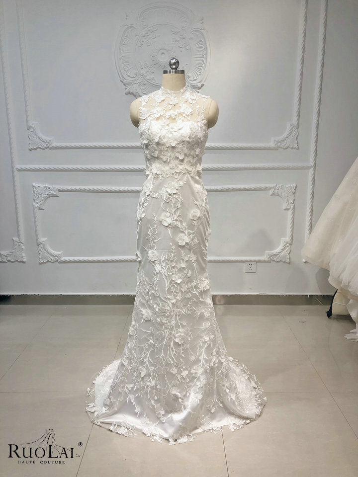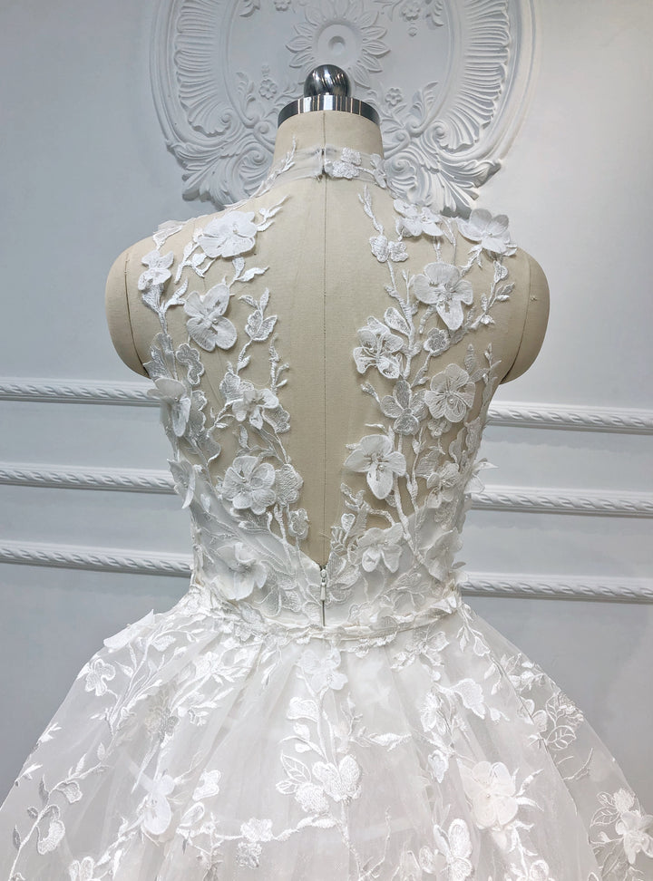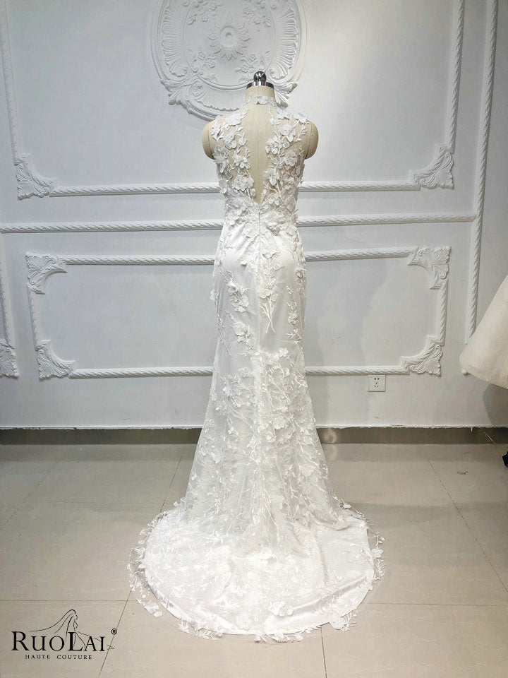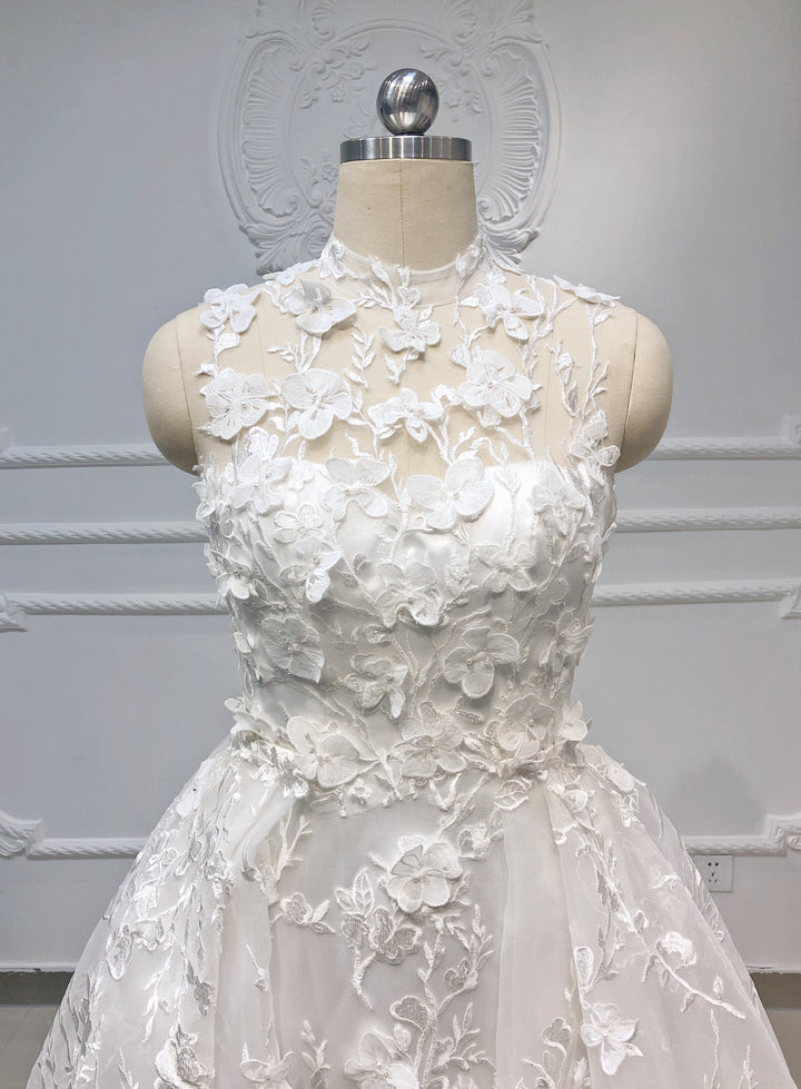 Luxury O Neck Lace Women Sleeveless Back with Buttons 2 in 1 Wedding Dress for Bride