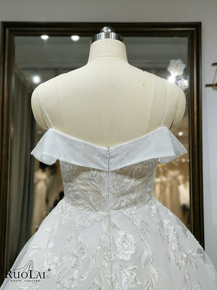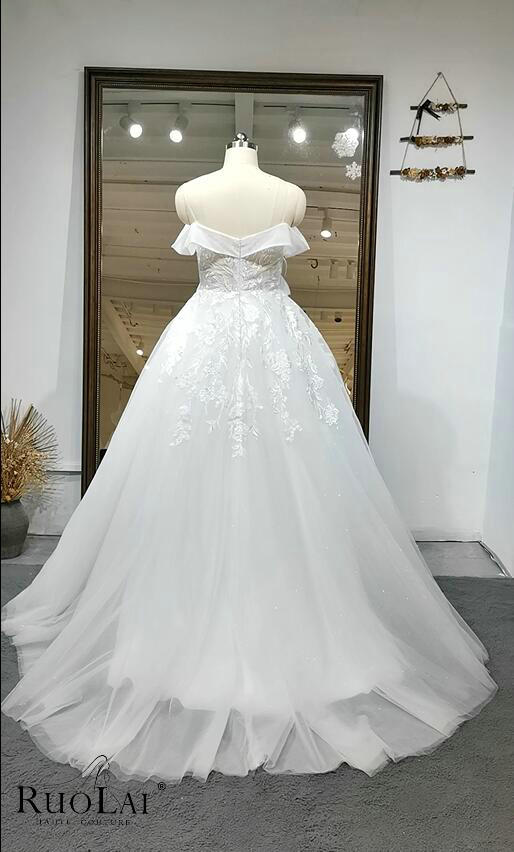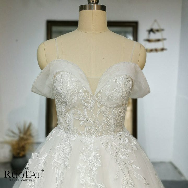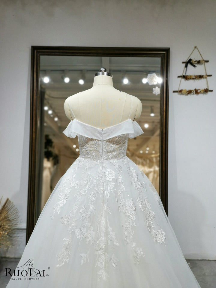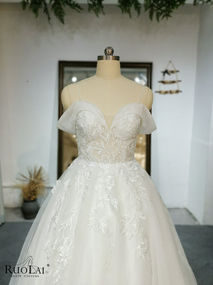 Luxury Off The Shoulder Sequins Tulle Wedding Dress Lace Applique Beaded Wedding Gown Straps Sweetheart Neckline Back with Zipper Bridal Dress Sweep Train