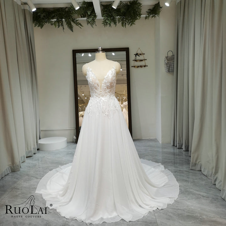 Luxury Spaghetti Strap Chiffon Long Boho Lace Wedding Dress Customized Deep V Neck Classic Bridal Beach Wedding Gowns Open Back