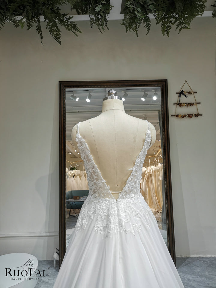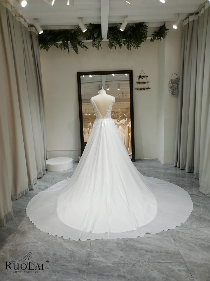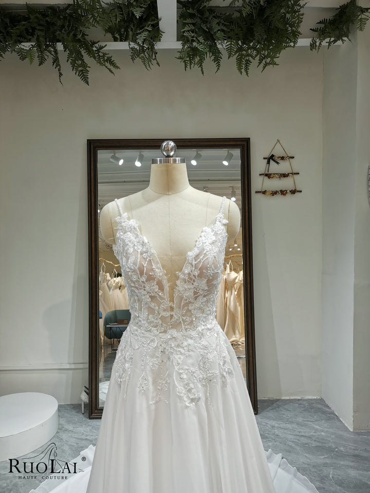 QW01793 Luxury Spaghetti Strap Chiffon Long Lace Wedding Dress