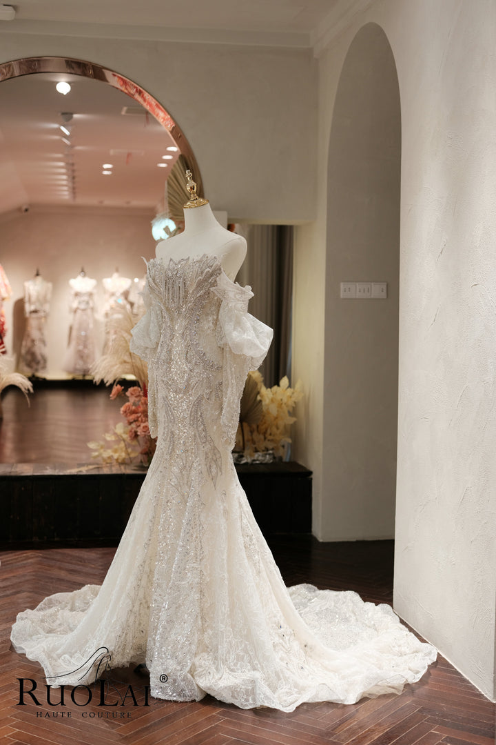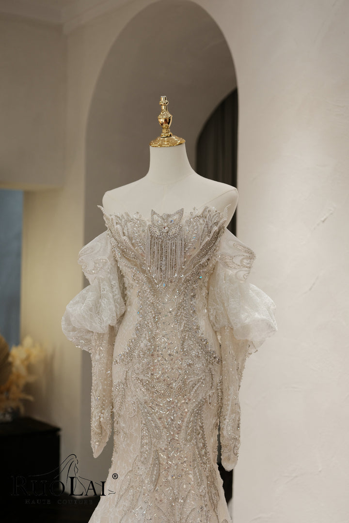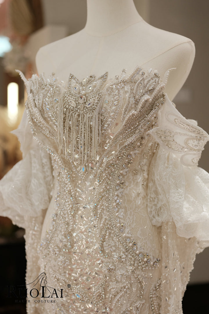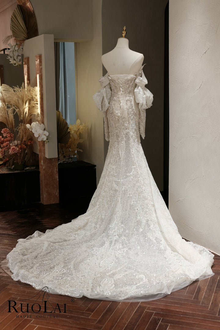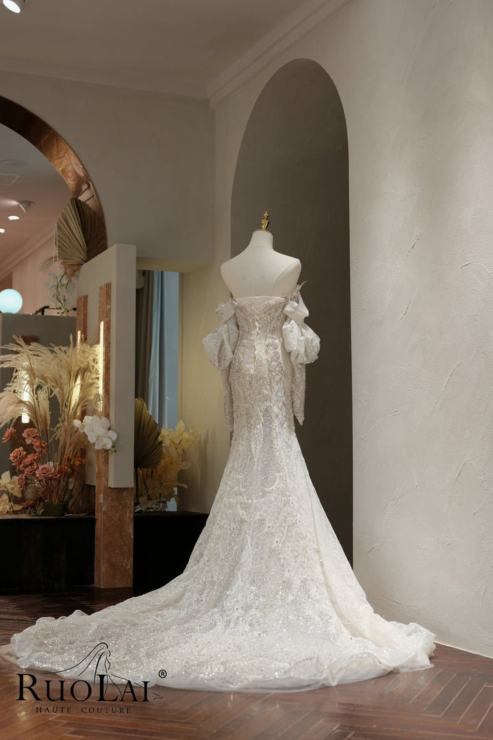 A collection of sparkling nebulae in a mermaid wedding dress, tailored to fit the body, sparing no effort to modify the perfect body shape, inlaid with luxurious and exquisite heavy crystal diamonds, flooded with sparkling starlight!