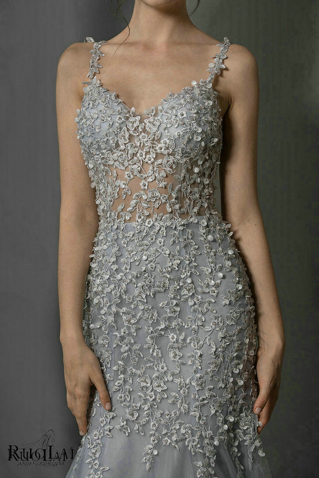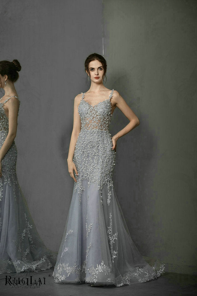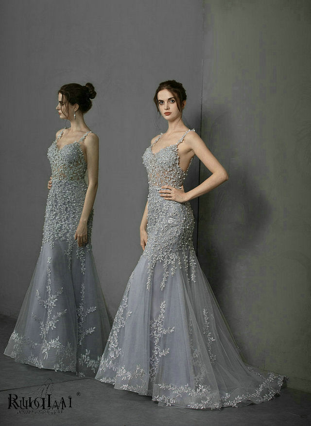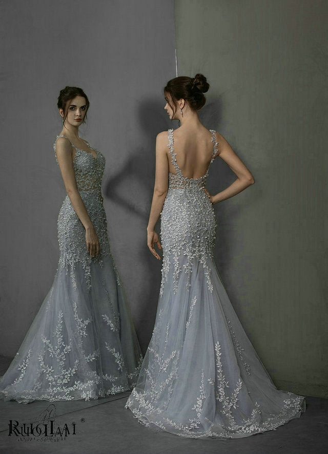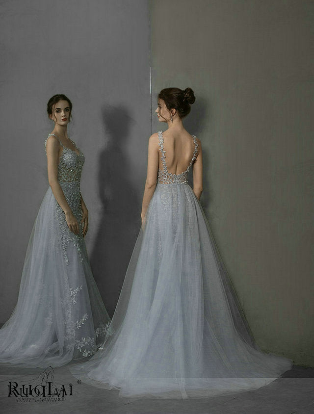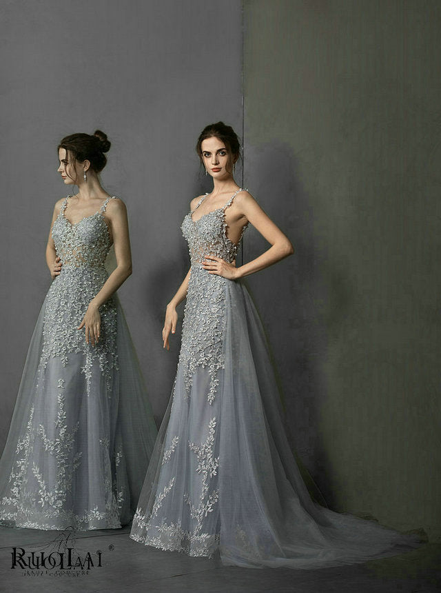 LWC6780 Elegant Detachable Train Lace Open Back Evening Dress