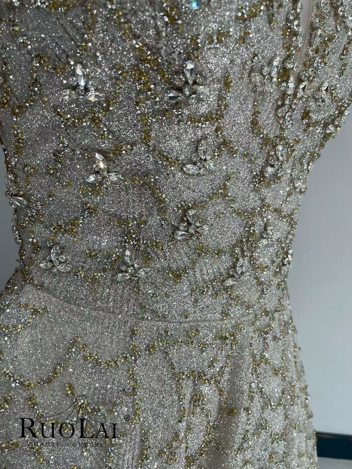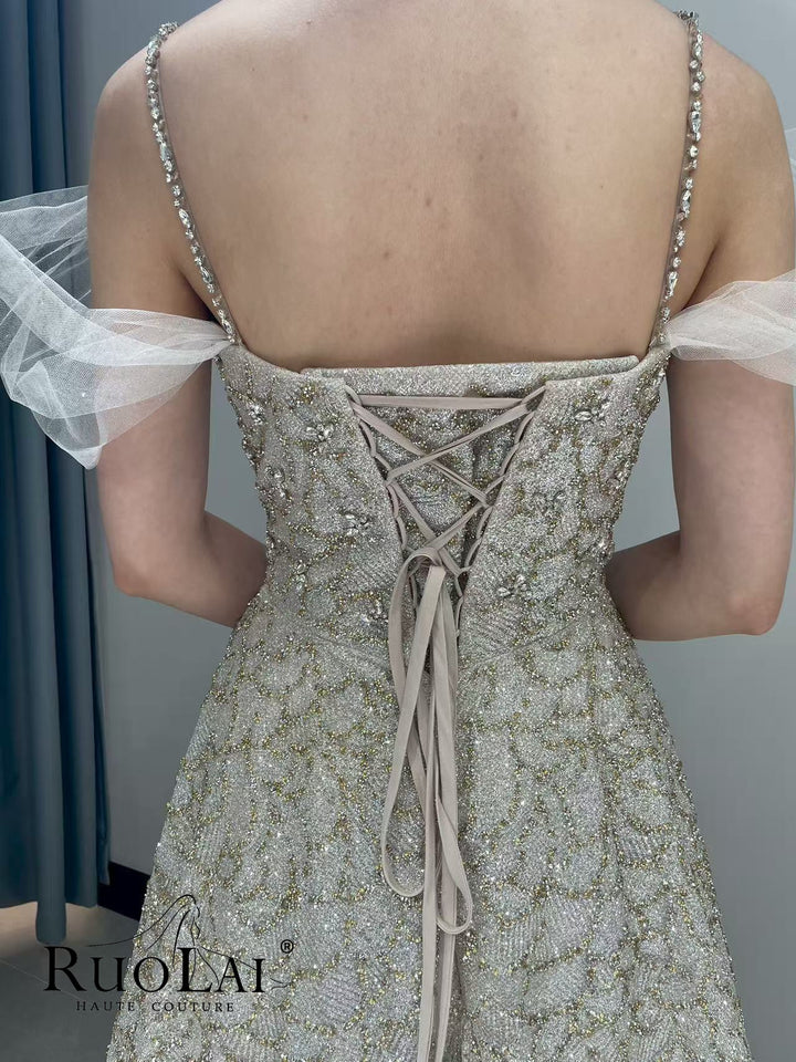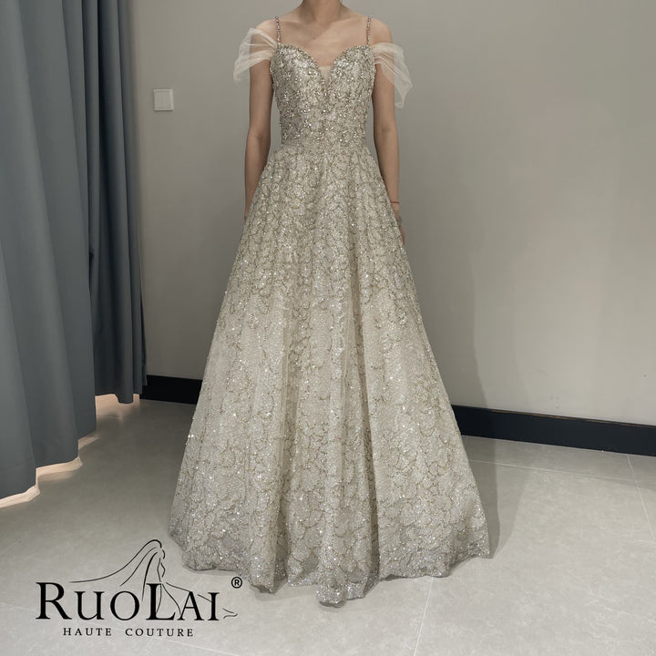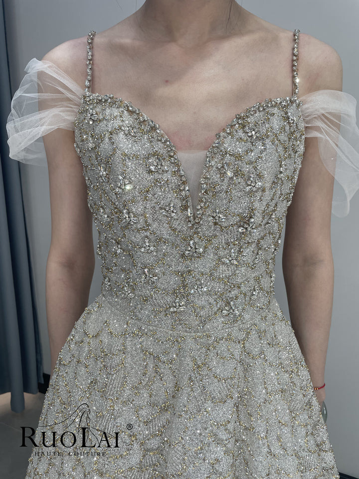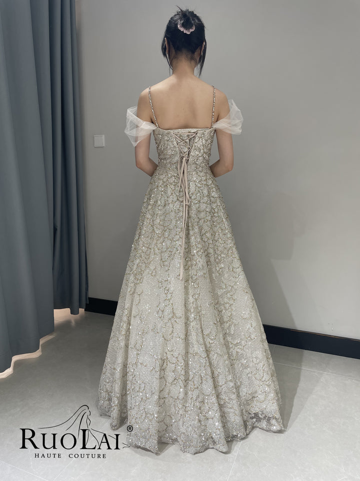This luxurious A-line, off-the-shoulder sequined ball gown features an A-line silhouette that flatters all body types. Perfect for a memorable appearance, this gown boasts attention to detail, combining sophistication and style, making it the perfect choice for formal occasions and special events.