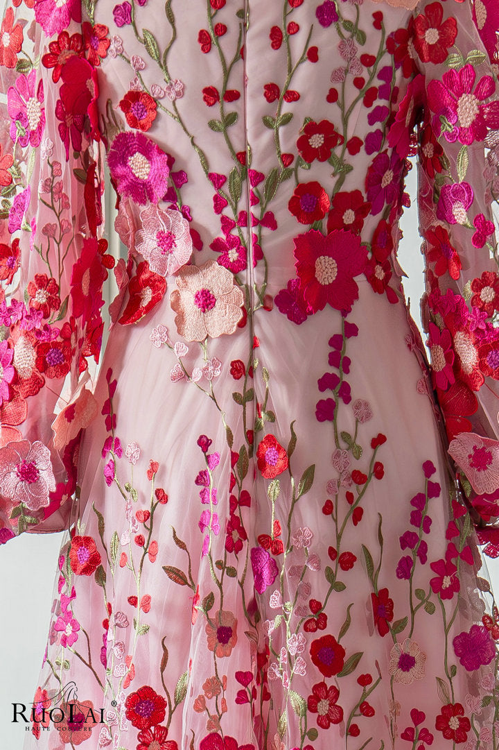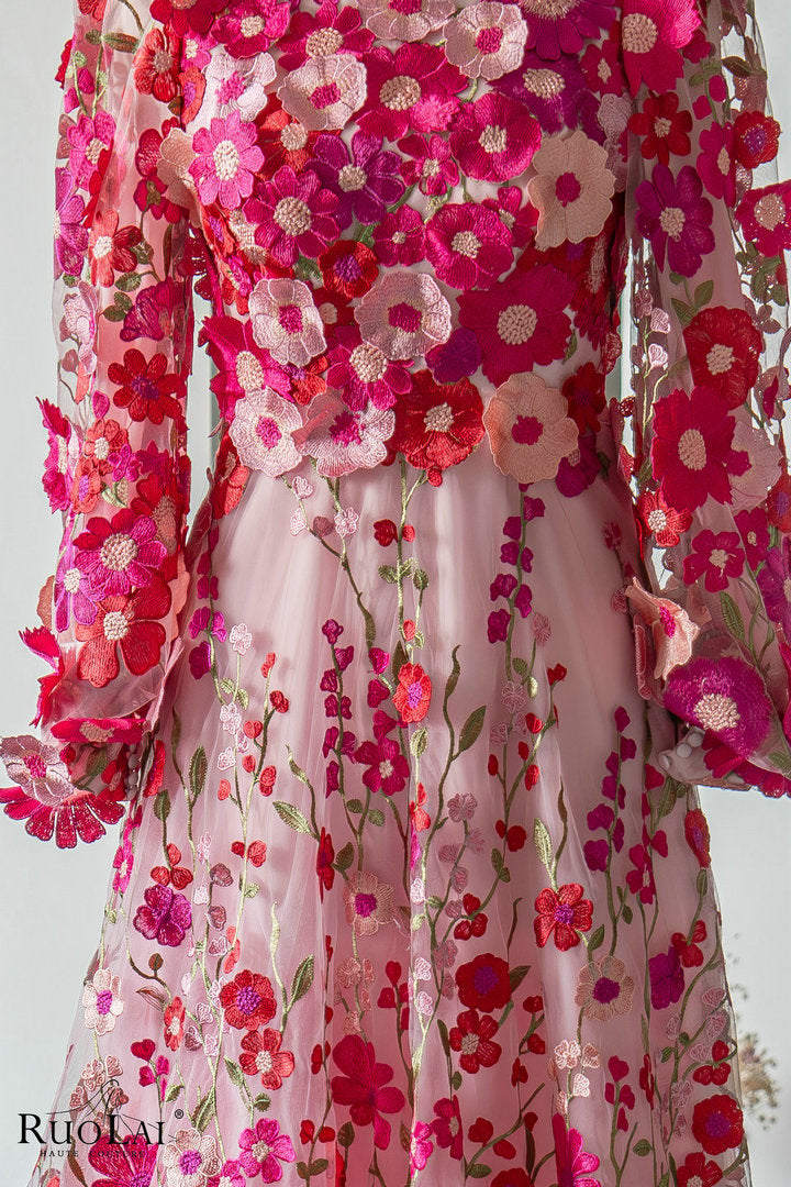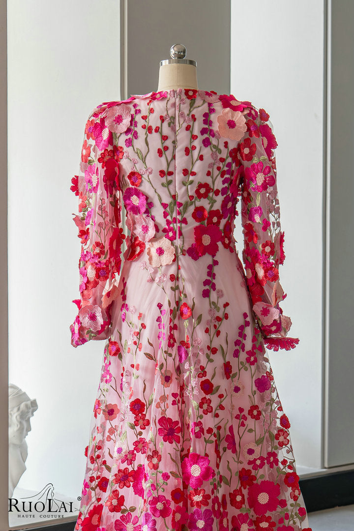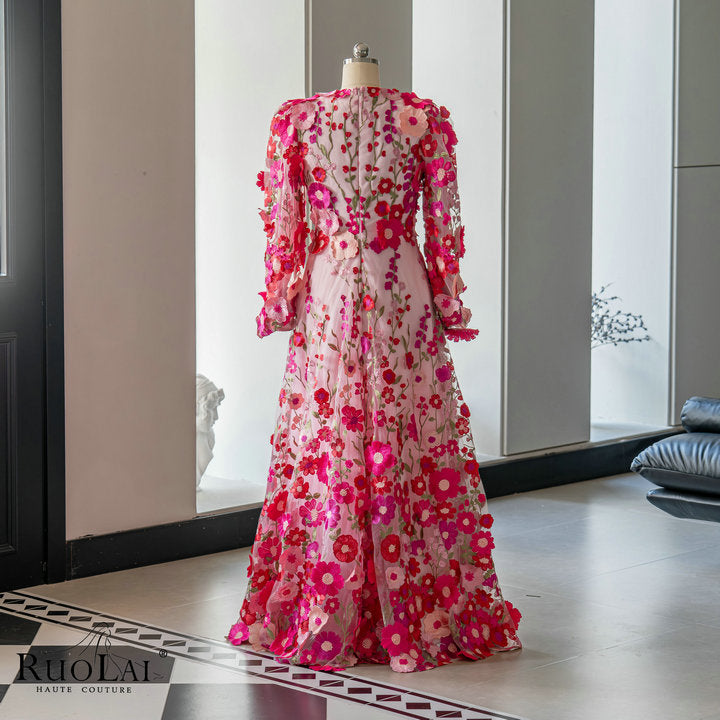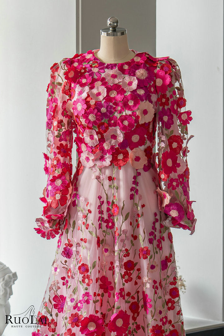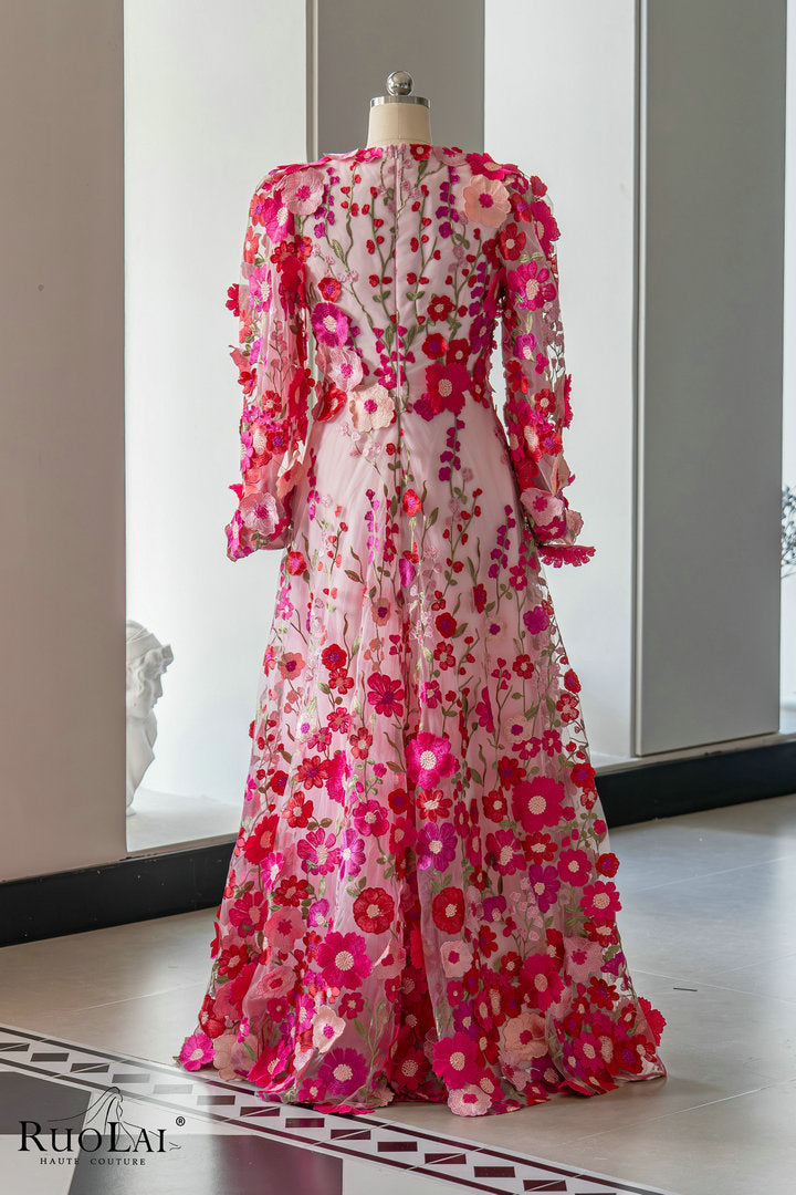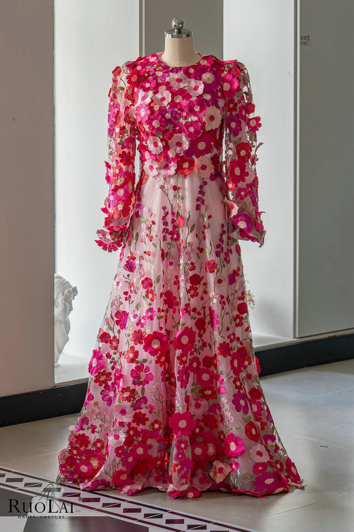 Elevate your evening elegance with this luxurious 3D floral evening gown. This exquisite gown features intricately crafted 3D floral appliqués for added dimension and texture, while puffed long sleeves add a touch of sophistication and sparkle. The deep pink hue enhances the feminine look, while the expertly tailored silhouette ensures a captivating look for formal occasions. Designed for those with a keen eye for detail and elegance, this gown seamlessly blends artistry and luxury for an unforgettable look.