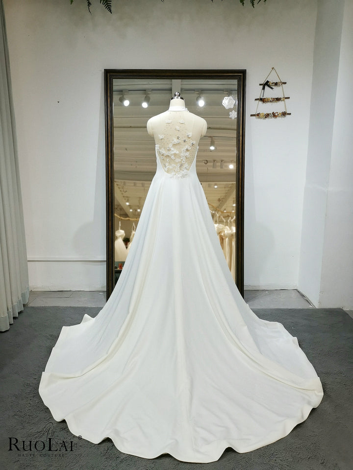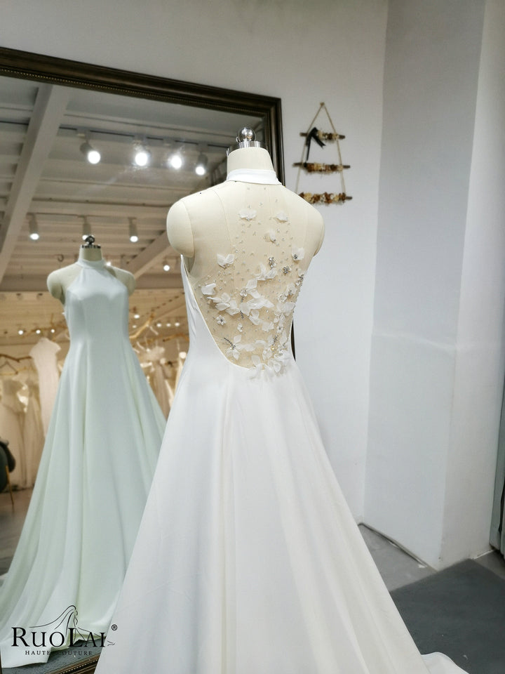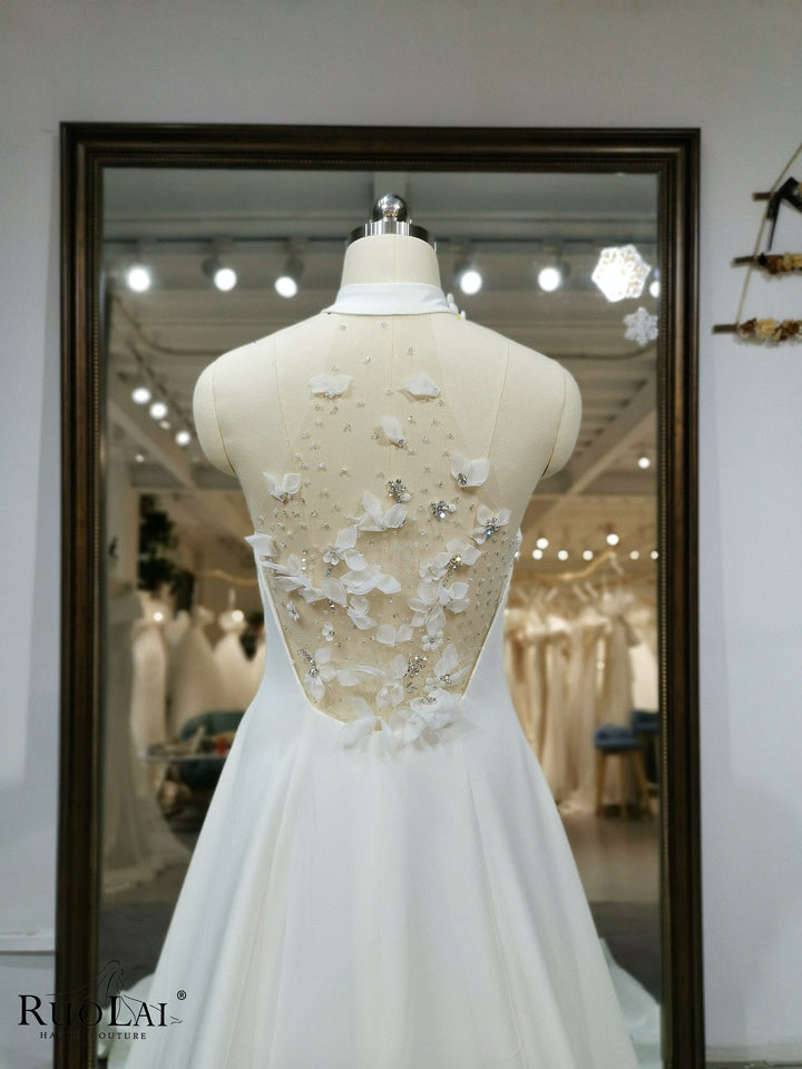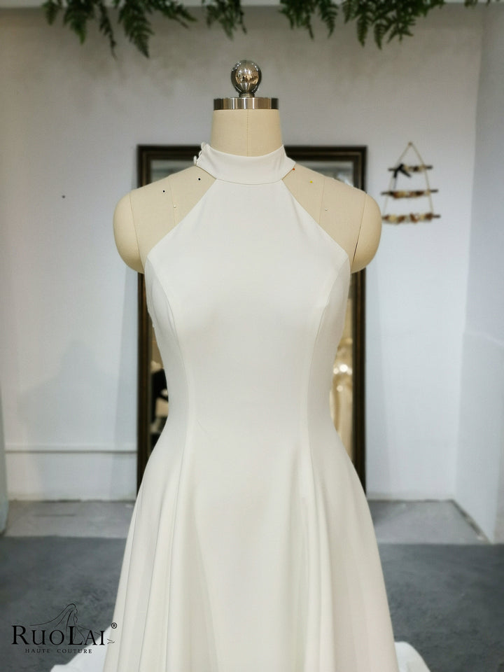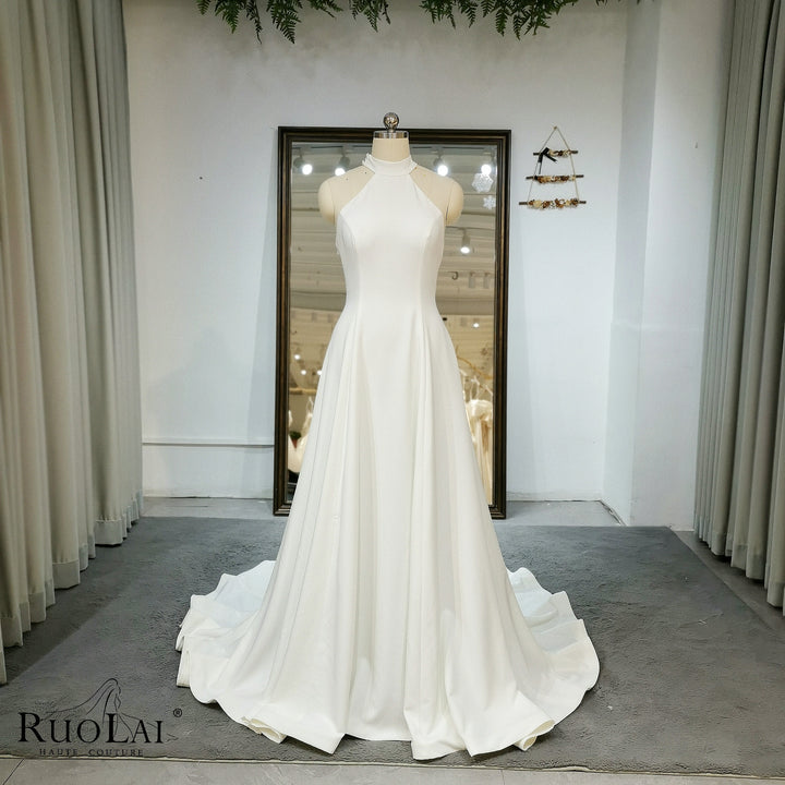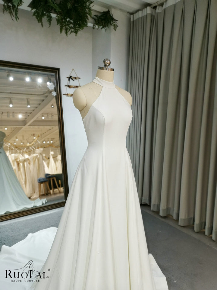QD06113 Minimalist Style Halter Sleeve Satin A Line Wedding Dress