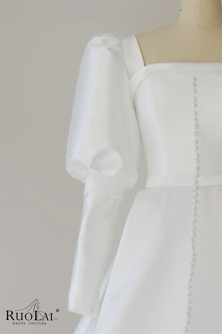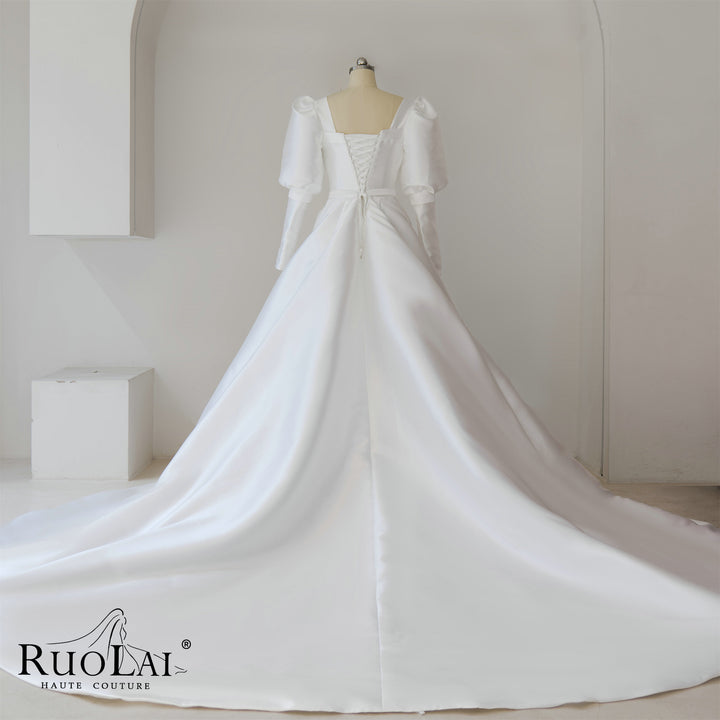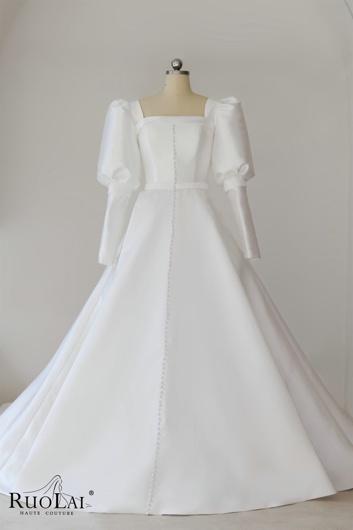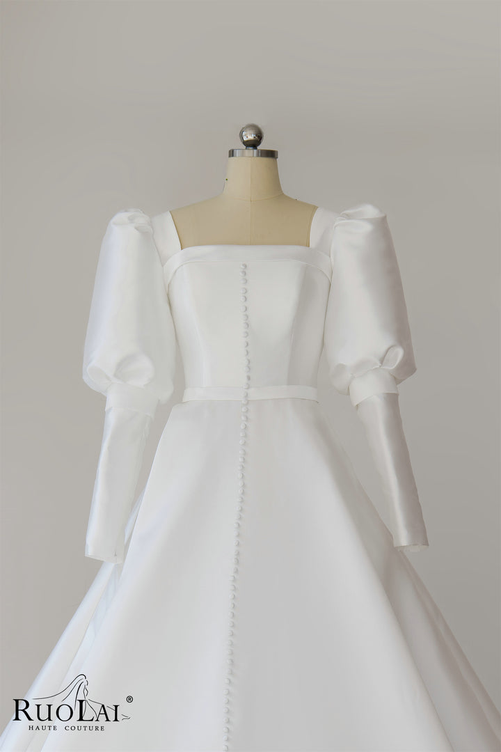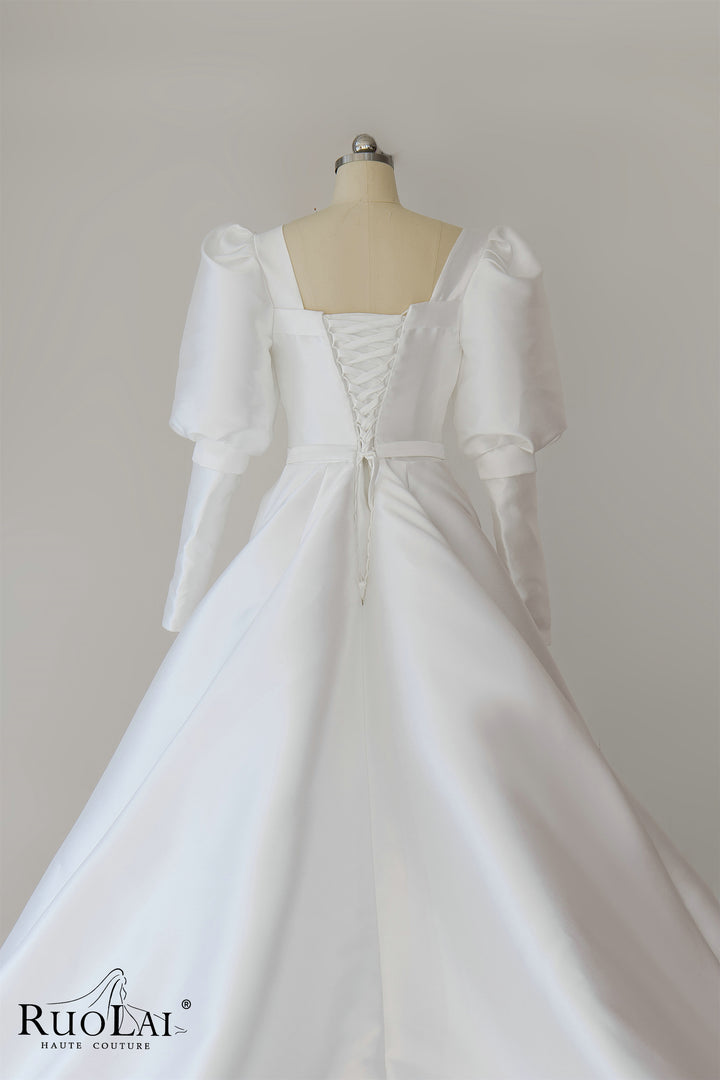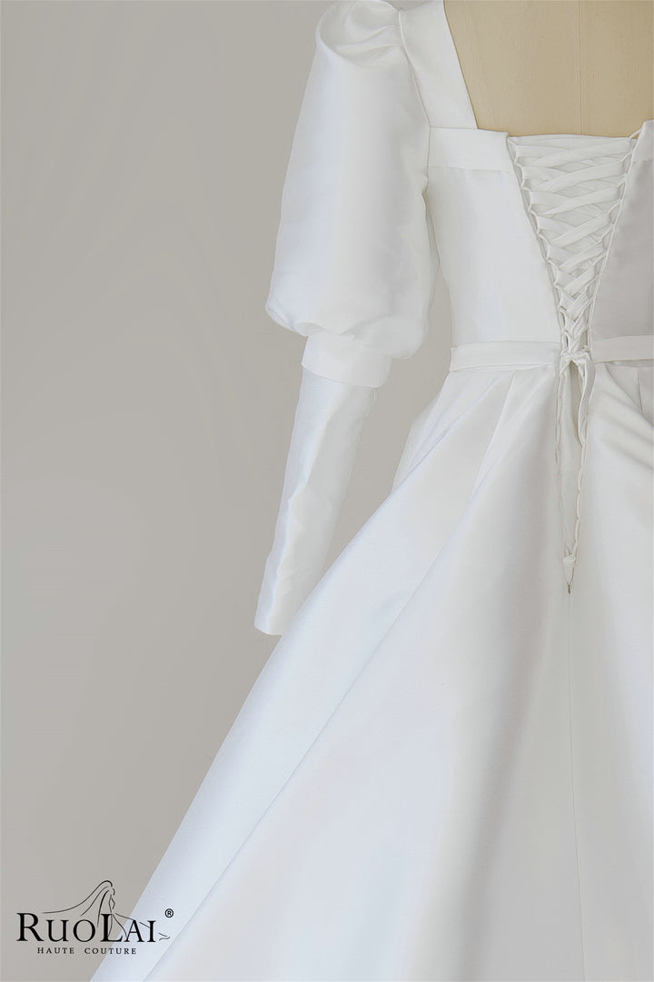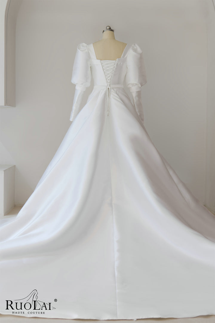 Modern Square Collar Long Lantern Sleeve Satin Wedding Dress