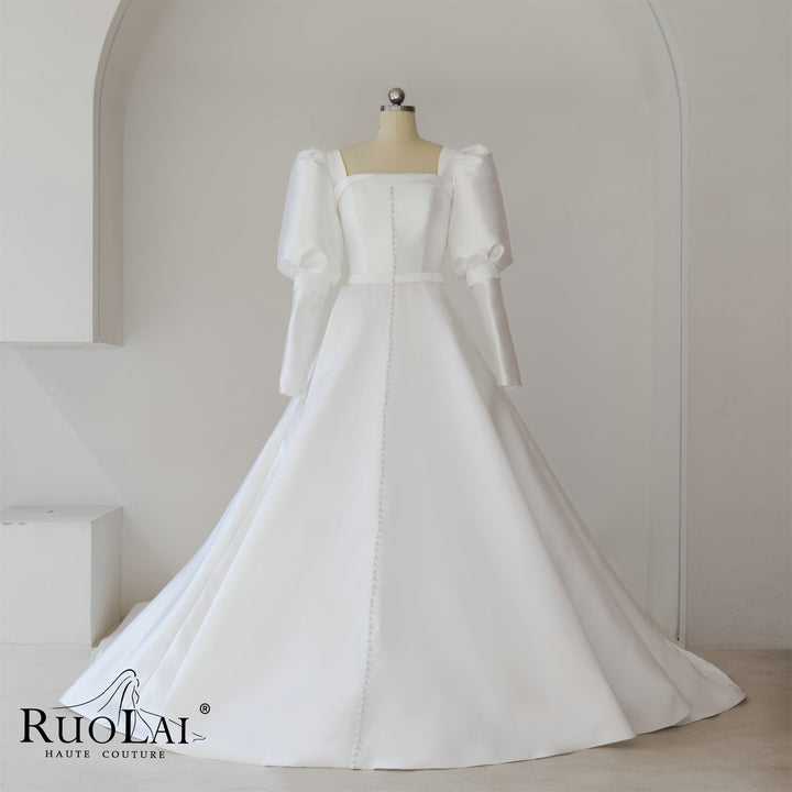 Modern Square Collar Satin Wedding Dress Women Long Lantern Sleeve A Line Bride Gown Button Chapel Train
