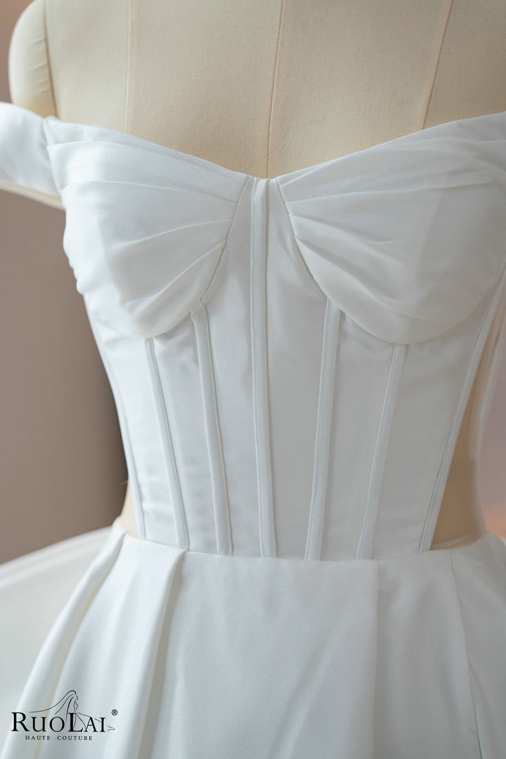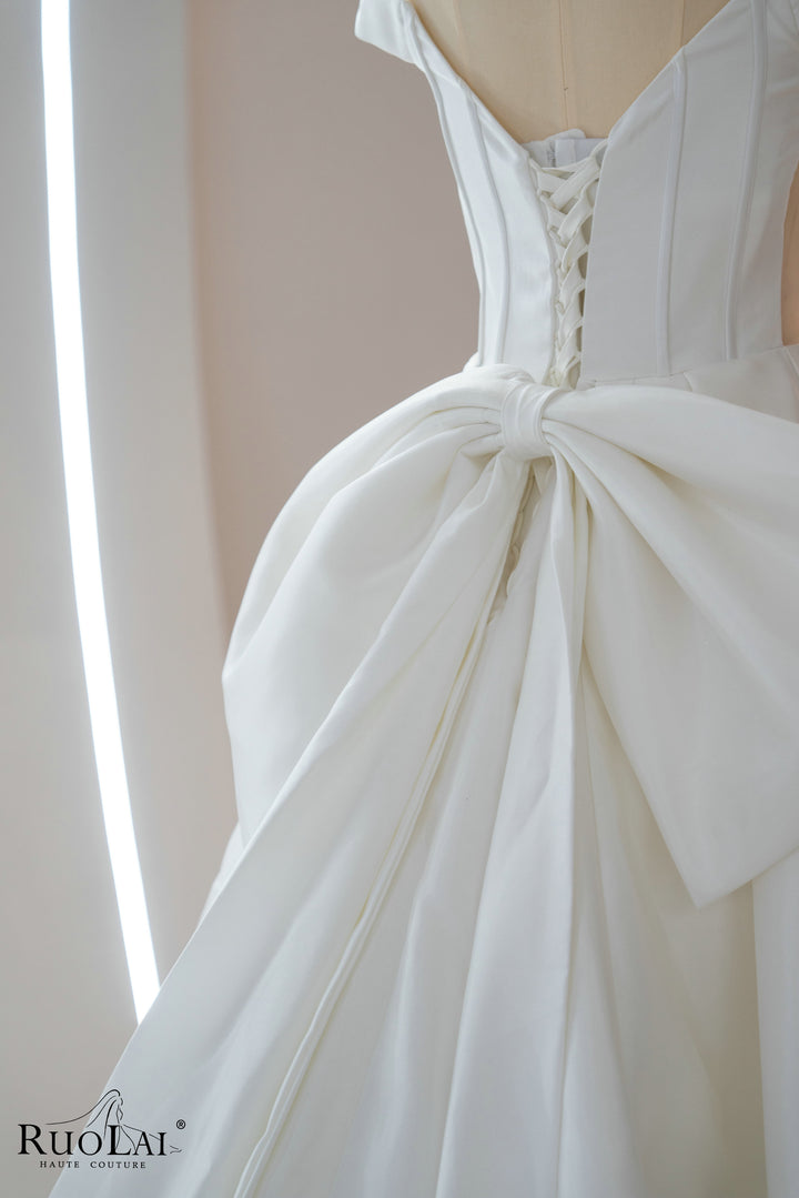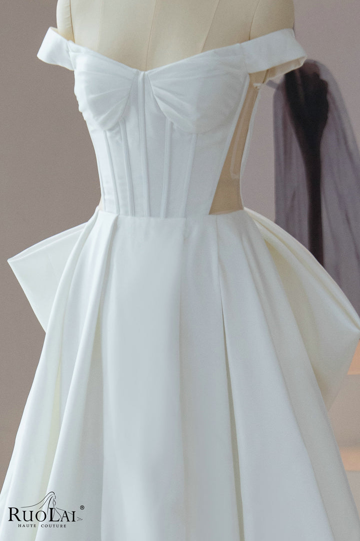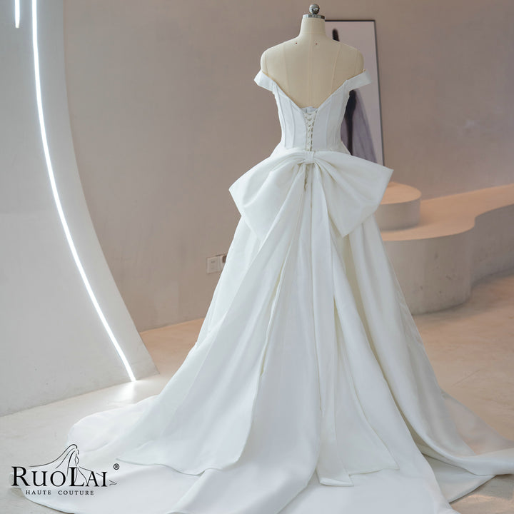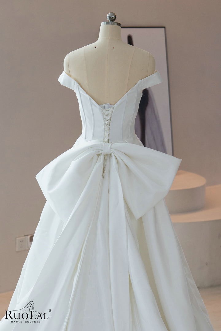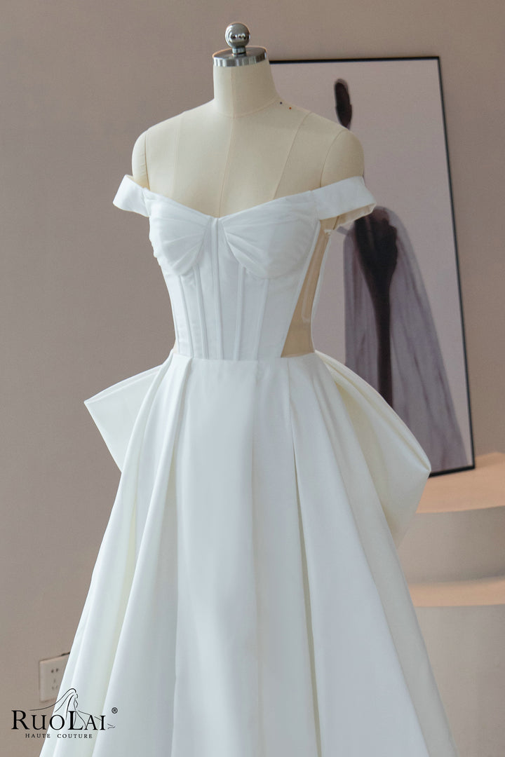 Off Shoulder Sleeveless Corsets Back Bow Satin Bridal Wedding Dresses