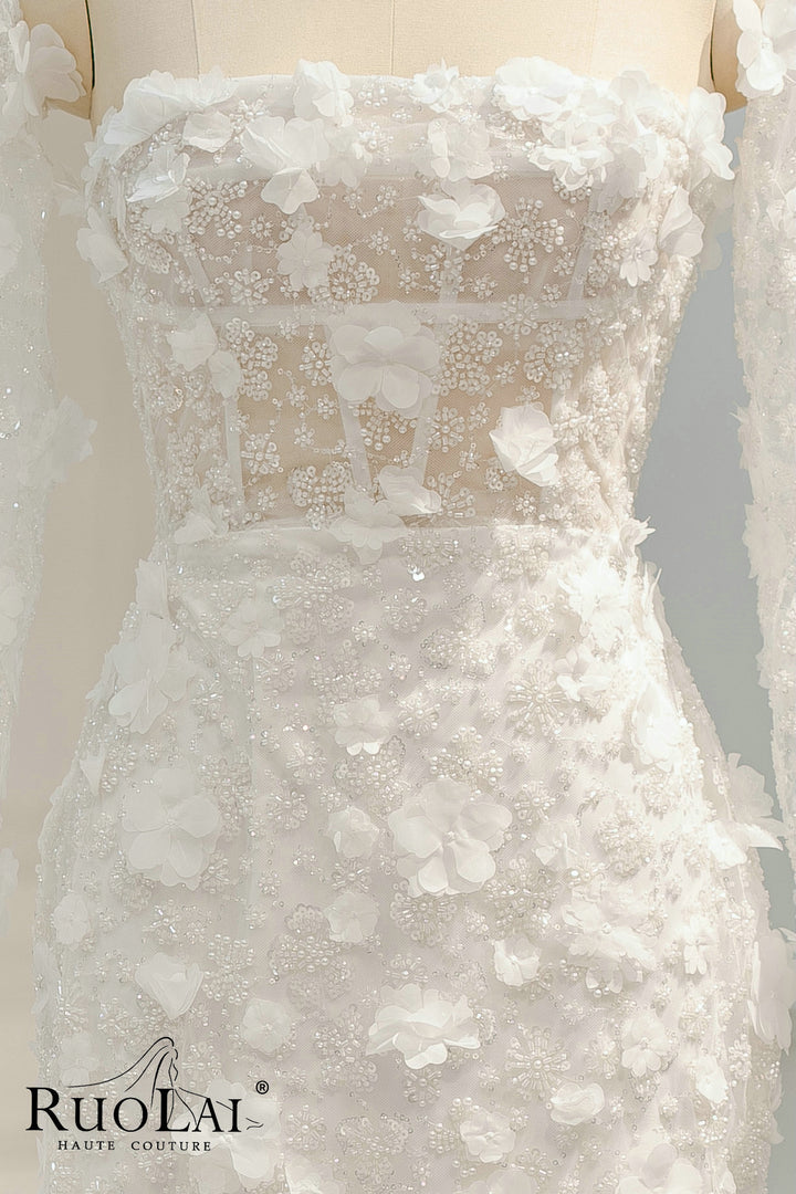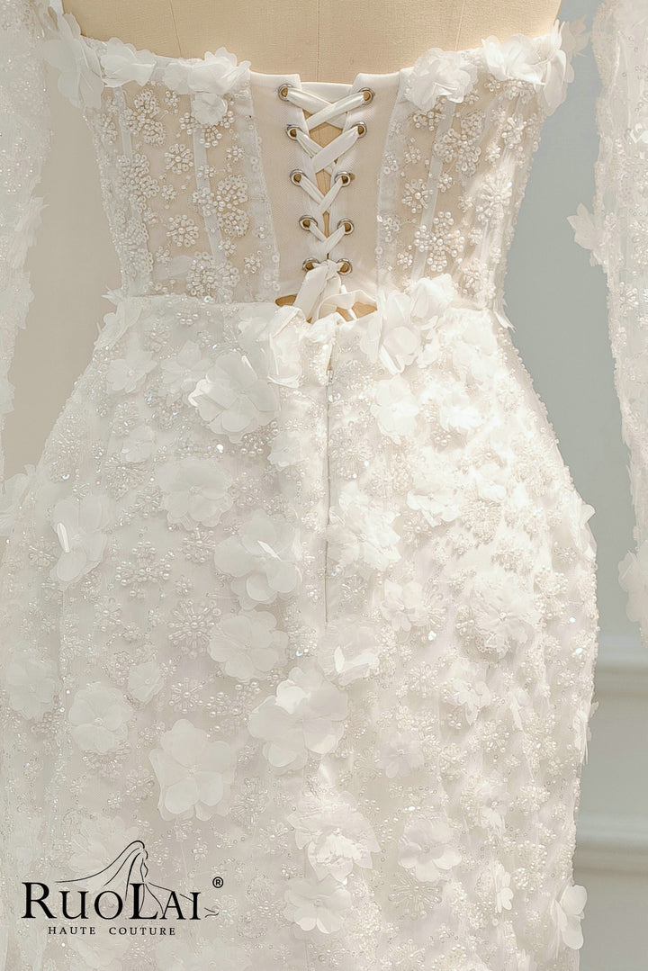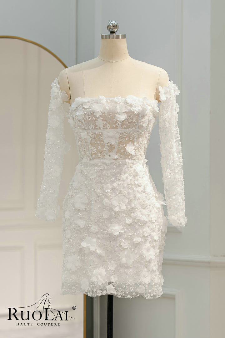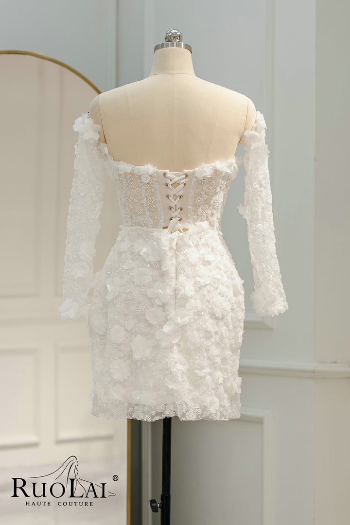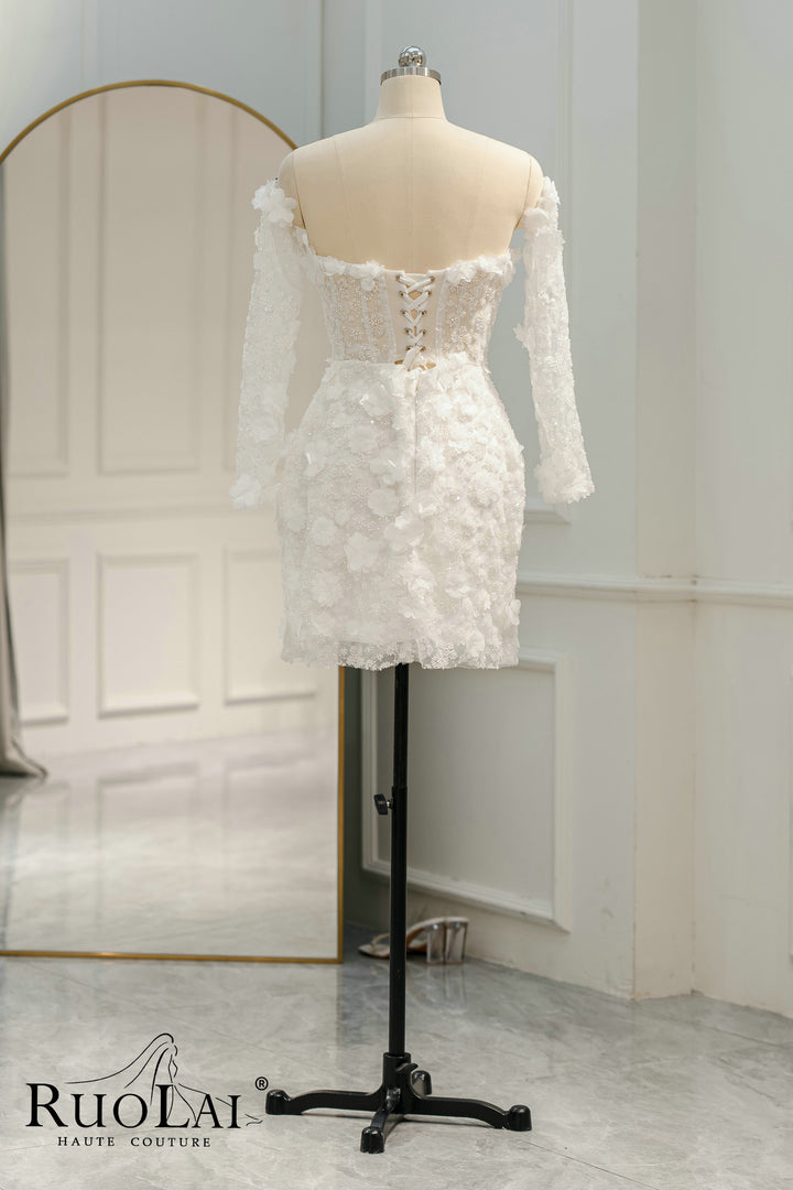 Pretty Short Wedding Dresses White Stapless Flowers Mermaid Long Sleeves Lace Up Back Bridal Gown.
