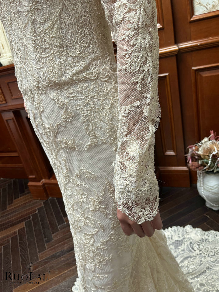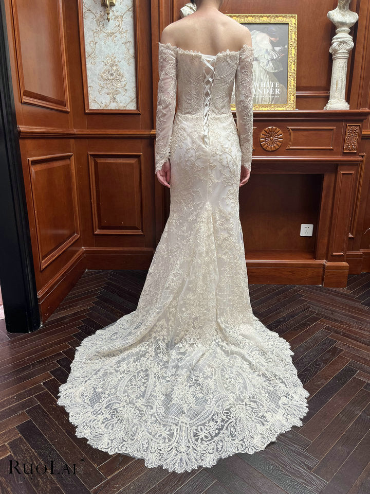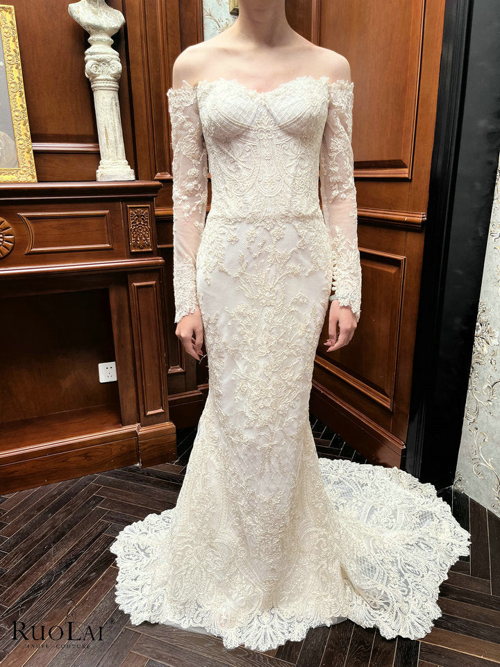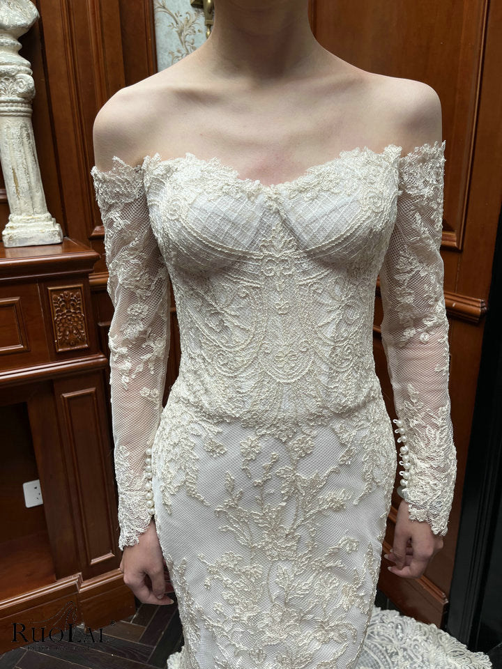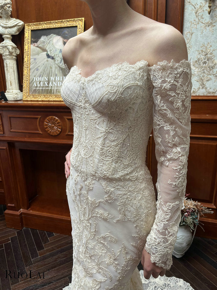 This elegant shiny ivory off shoulder long sleeves lace applique mermaid bridal gowns, designed to enhance your silhouette gracefully. The mermaid cut offers a timeless shape that drapes beautifully, making it an ideal choice for wedding. Crafted with attention to detail, this dress combines sophistication with comfort for a refined, expert look.