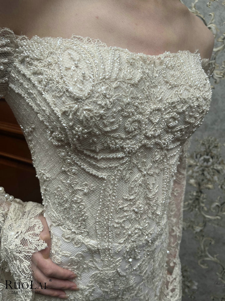 This elegant Sheath Off Shoulder Sleeves Heavy Beads Embroidered Lace  Dress for Wedding, designed to enhance your silhouette gracefully. The A-line cut offers a timeless shape that drapes beautifully, making it an ideal choice for wedding. Crafted with attention to detail, this dress combines sophistication with comfort for a refined, expert look.