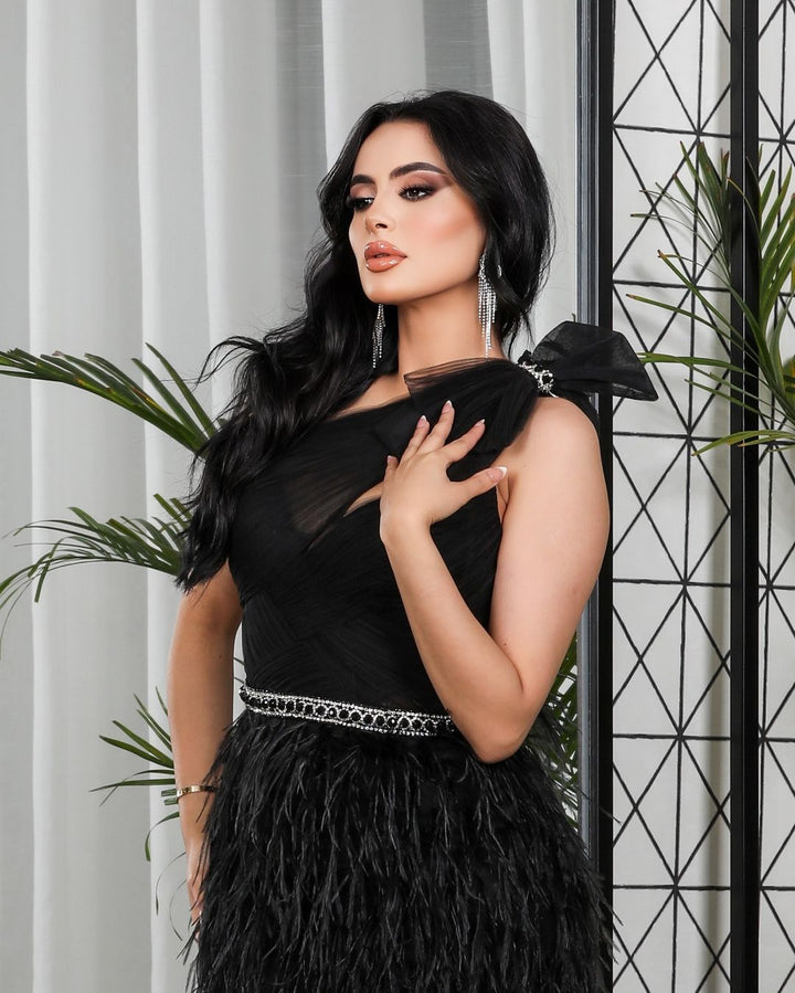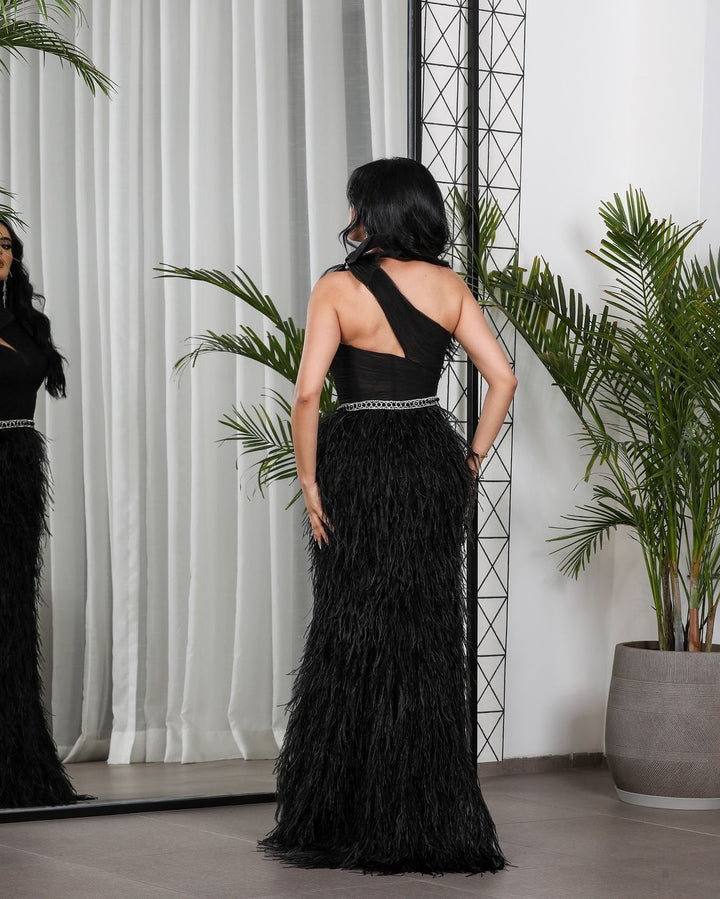 Sexy Black One Shoulder Satin Mermaid Elegant Long Party Dresses Bow with Feather Party Gown