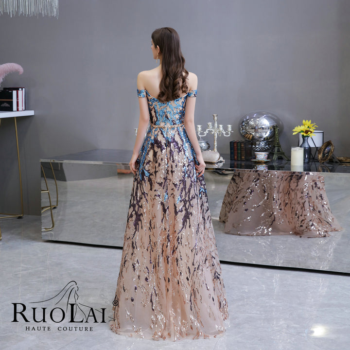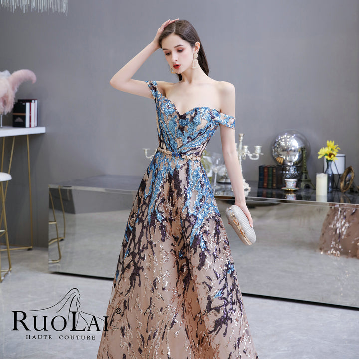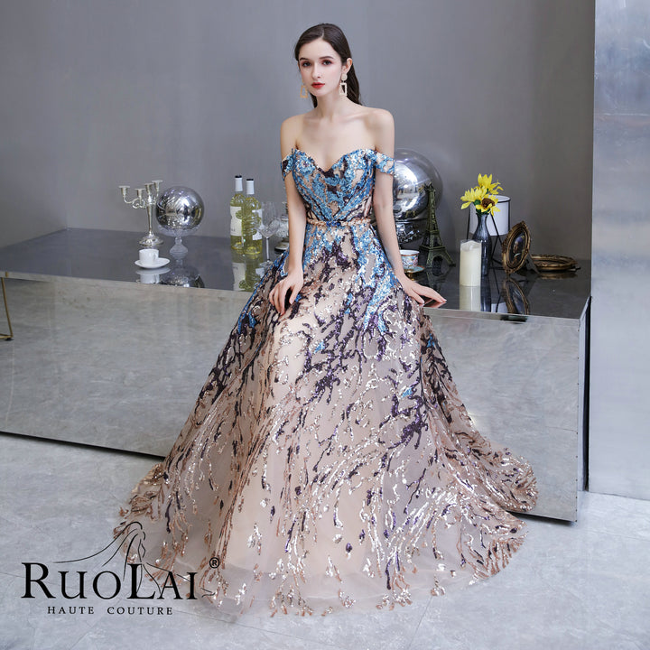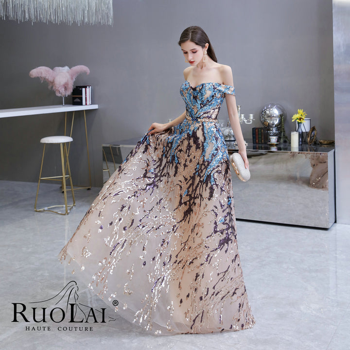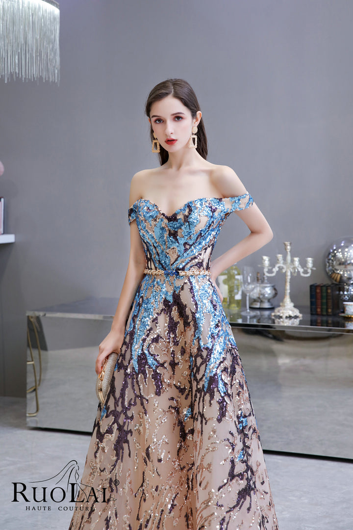 Customized Sexy Sweetheart Neckline Evening Dresses Off the shoulder A-Line Colorful Sequin Formal Dress Long Prom Gowns