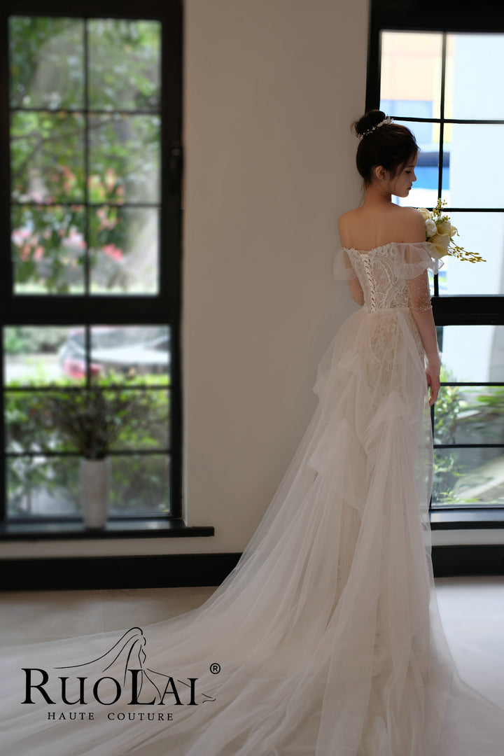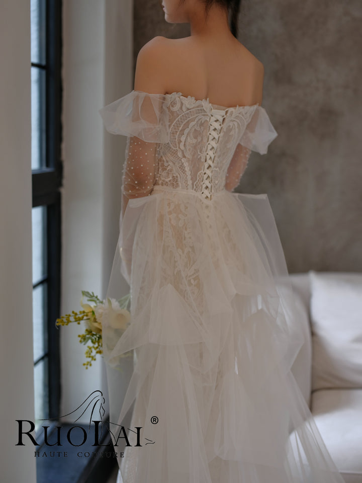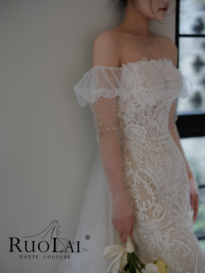 Elegant off shoulder strapless mermaid wedding dress unique and  high quality lace illusion long sleeve with tulle court train simple bridal gown.