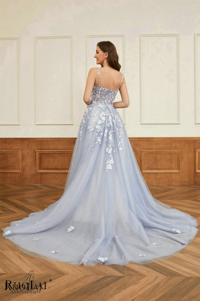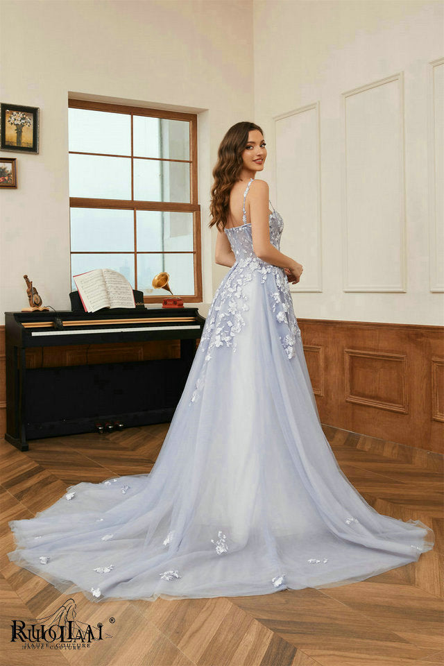Stunning Spaghtti Strap Real Sample Sweetheart Neck Appliques Lace Sleeveless Court Train Evening Party Dresses for Women